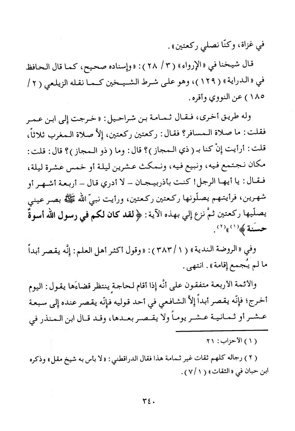 وله طريق أخرى، فقال ثمامة بن شراحيل: "خرجت إِلى ابن عمر فقلت: ما صلاة المسافر؟ فقال: ركعتين ركعتين، إلاَّ صلاة المغرب ثلاثاً، قلت: أرأيت إِنْ كنا بـ (ذي المجاز)؟ قال: وما (ذو المجاز)؟ قال: قلت: مكان نجتمع فيه، ونبيع فيه، ونمكث عشرين ليلة أو خمس عشرة ليلة، فقال: يا أيها الرجل! كنت بأذربيجان -لا أدري قال- أربعة أشهر أو شهرين، فرأيتهم يصلّونها ركعتين ركعتين، ورأيت نبيّ الله - صَلَّى اللَّهُ عَلَيْهِ وَسَلَّمَ - بصر عيني يصلّيها ركعتين ثمَّ نزع إِلي بهذه الآية: {لقد كان لكم في رسول الله أسوةٌ حسَنة} (¬1) " (¬2).