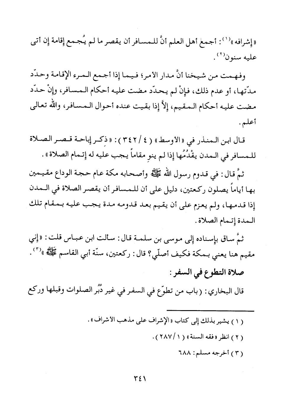 ثمَّ ساق بإِسناده إِلى موسى بن سلمة قال: سألت ابن عباس قلت: "إِني مقيم هنا يعني بمكة فكيف أصلّي؟ قال: ركعتين، سنّة أبي القاسم - صَلَّى اللَّهُ عَلَيْهِ وَسَلَّمَ -" (¬3).