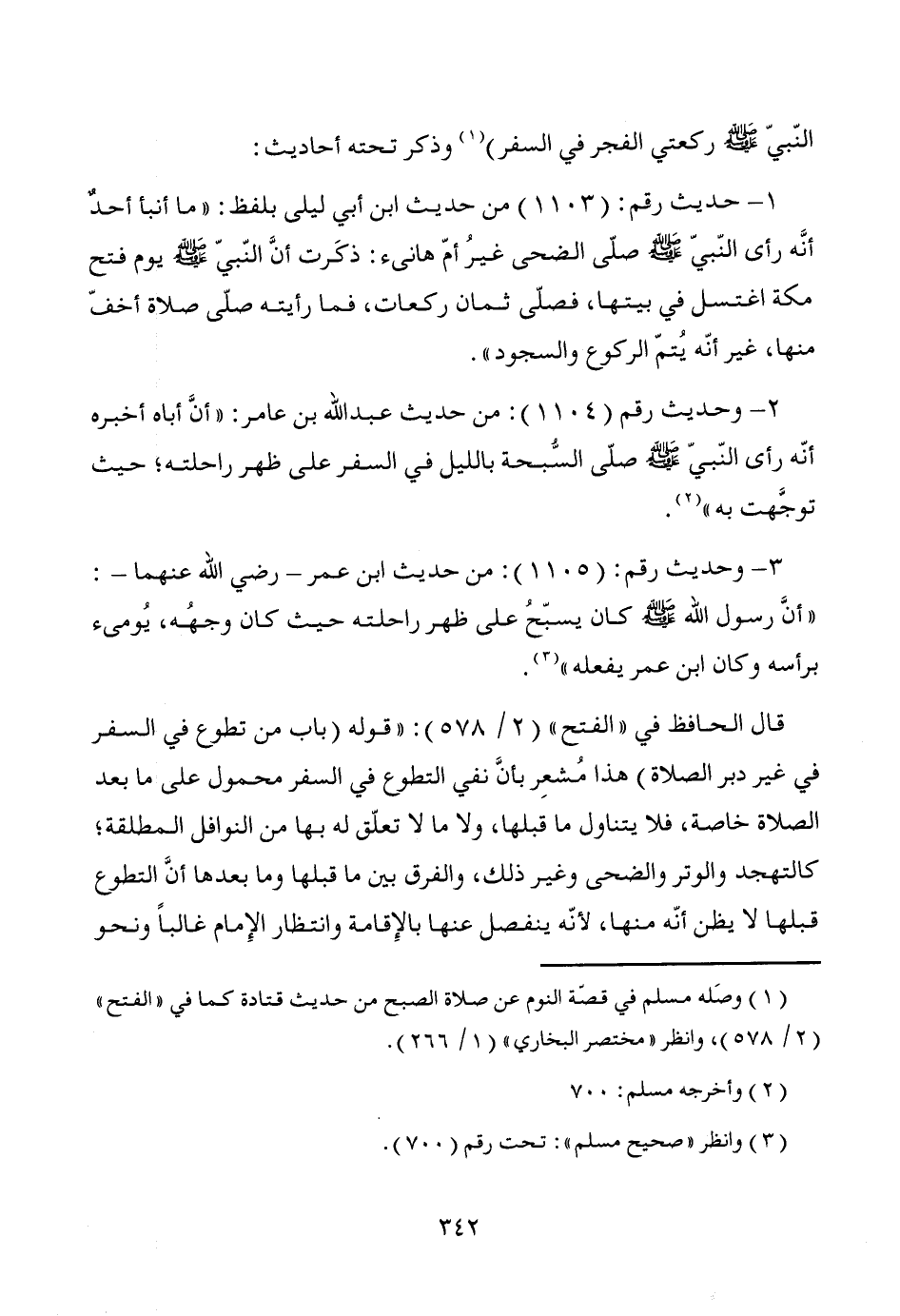3 - وحديث رقم: (1105): من حديث ابن عمر -رضي الله عنهما-: "أنَّ رسول الله - صَلَّى اللَّهُ عَلَيْهِ وَسَلَّمَ - كان يسبّحُ على ظهر راحلته حيث كان وجهُه، يُومئ برأسه وكان ابن عمر يفعله" (¬3).