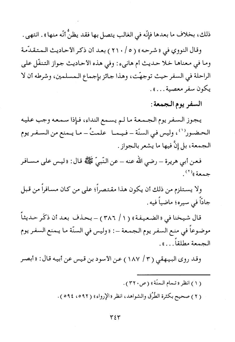 يجوز السفر يوم الجمعة ما لم يسمع النداء، فإِذا سمعه وجب عليه الحضور (¬1)، وليس في السنّة -فيما علمتُ- ما يمنع من السفر يوم الجمعة، بل إِنَّ فيها ما يشعر بالجواز.