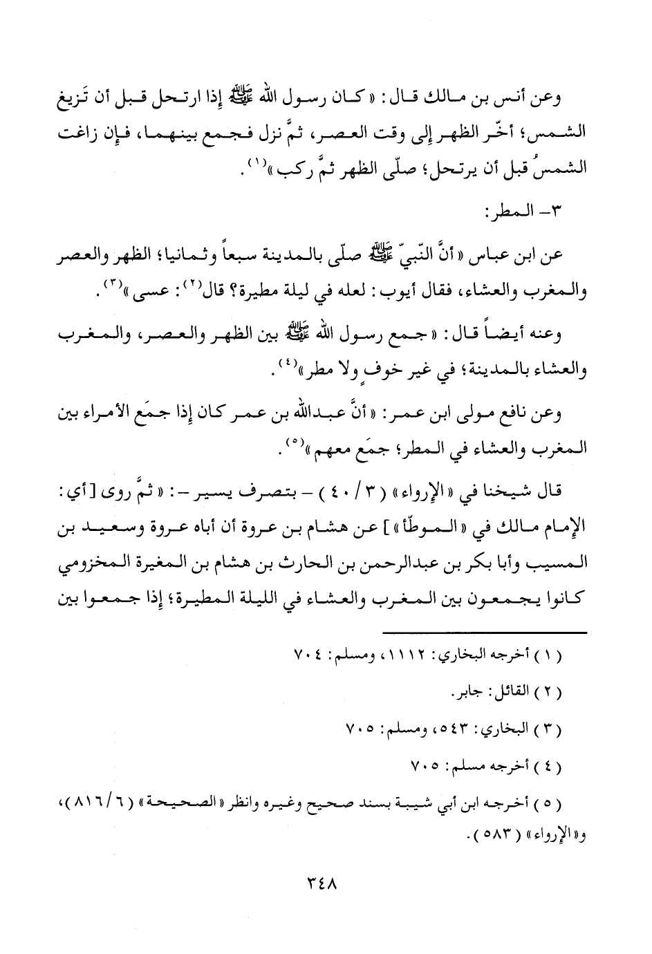 قال شيخنا في "الإِرواء" (3/ 40) -بتصرف يسير-: "ثمَّ روى [أي: الإِمام مالك في "الموطّأ"] عن هشام بن عروة أن أباه عروة وسعيد بن المسيب وأبا بكر بن عبد الرحمن بن الحارث بن هشام بن المغيرة المخزومي كانوا يجمعون بين المغرب والعشاء في الليلة المطيرة؛ إِذا جمعوا بين