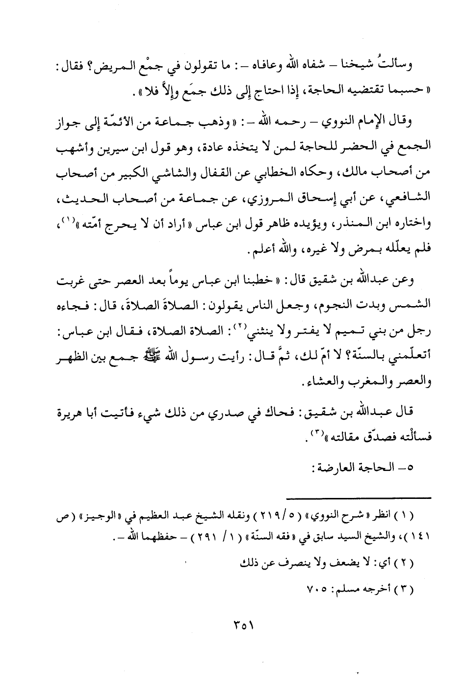 وقال الإِمام النووي -رحمه الله-: "وذهب جماعة من الأئمّة إِلى جواز الجمع في الحضر للحاجة لمن لا يتخذه عادة، وهو قول ابن سيرين وأشهب من أصحاب مالك، وحكاه الخطابي عن القفال والشاشي الكبير من أصحاب الشافعي، عن أبي إِسحاق المروزي، عن جماعة من أصحاب الحديث، واختاره ابن المنذر، ويؤيده ظاهر قول ابن عباس "أراد أن لا يحرج أمّته" (¬1)، فلم يعلّله بمرض ولا غيره، والله أعلم.
