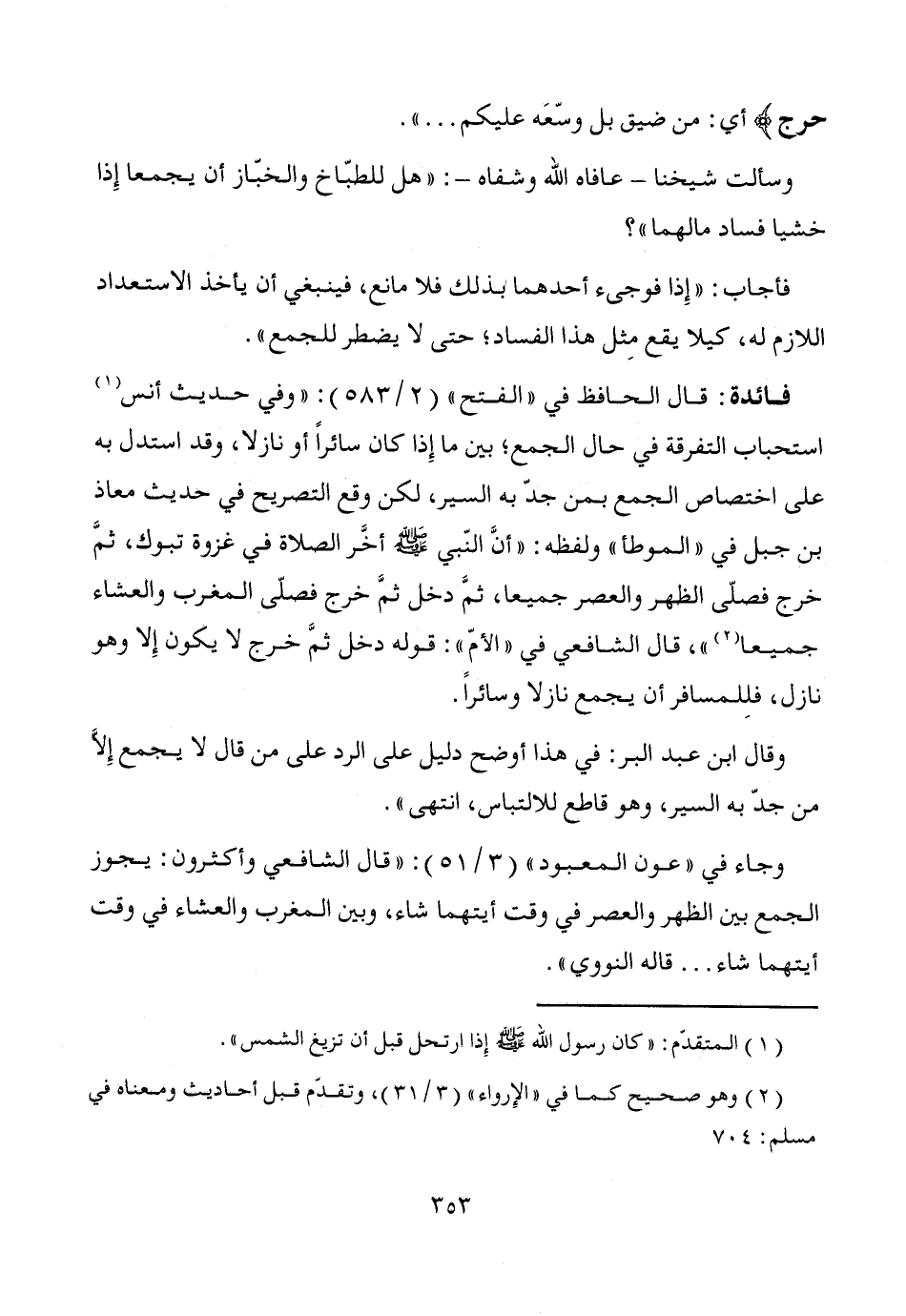 وقال ابن عبد البر: في هذا أوضح دليل على الرد على من قال لا يجمع إلاَّ من جدّ به السير، وهو قاطع للالتباس، انتهى".