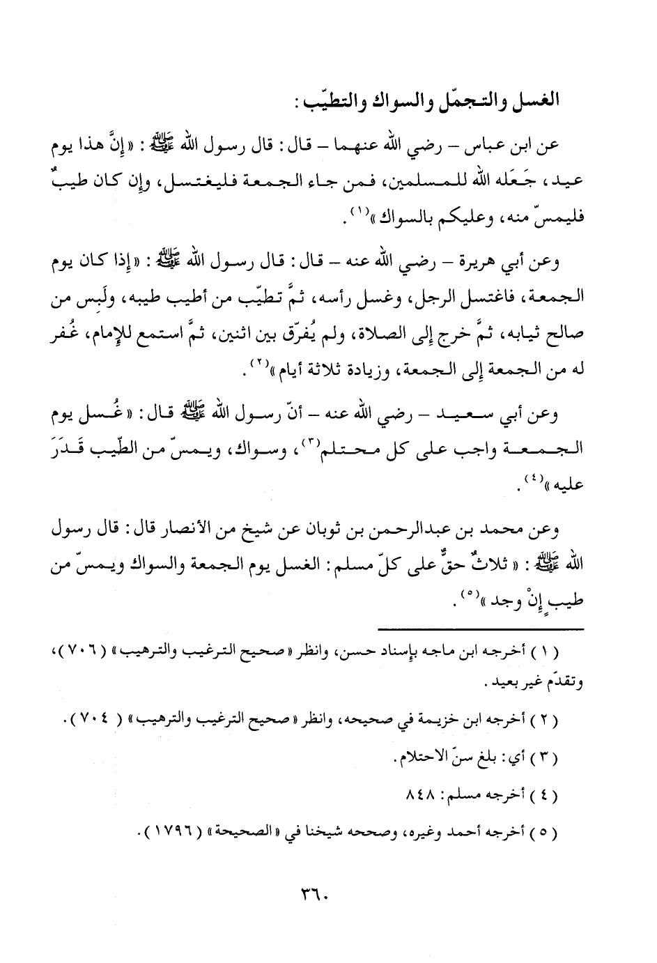 وعن محمد بن عبد الرحمن بن ثوبان عن شيخ من الأنصار قال: قال رسول الله - صَلَّى اللَّهُ عَلَيْهِ وَسَلَّمَ -: "ثلاثٌ حقٌّ على كلّ مسلم: الغسل يوم الجمعة والسواك ويمسّ من طيبٍ إِنْ وجد" (¬5).