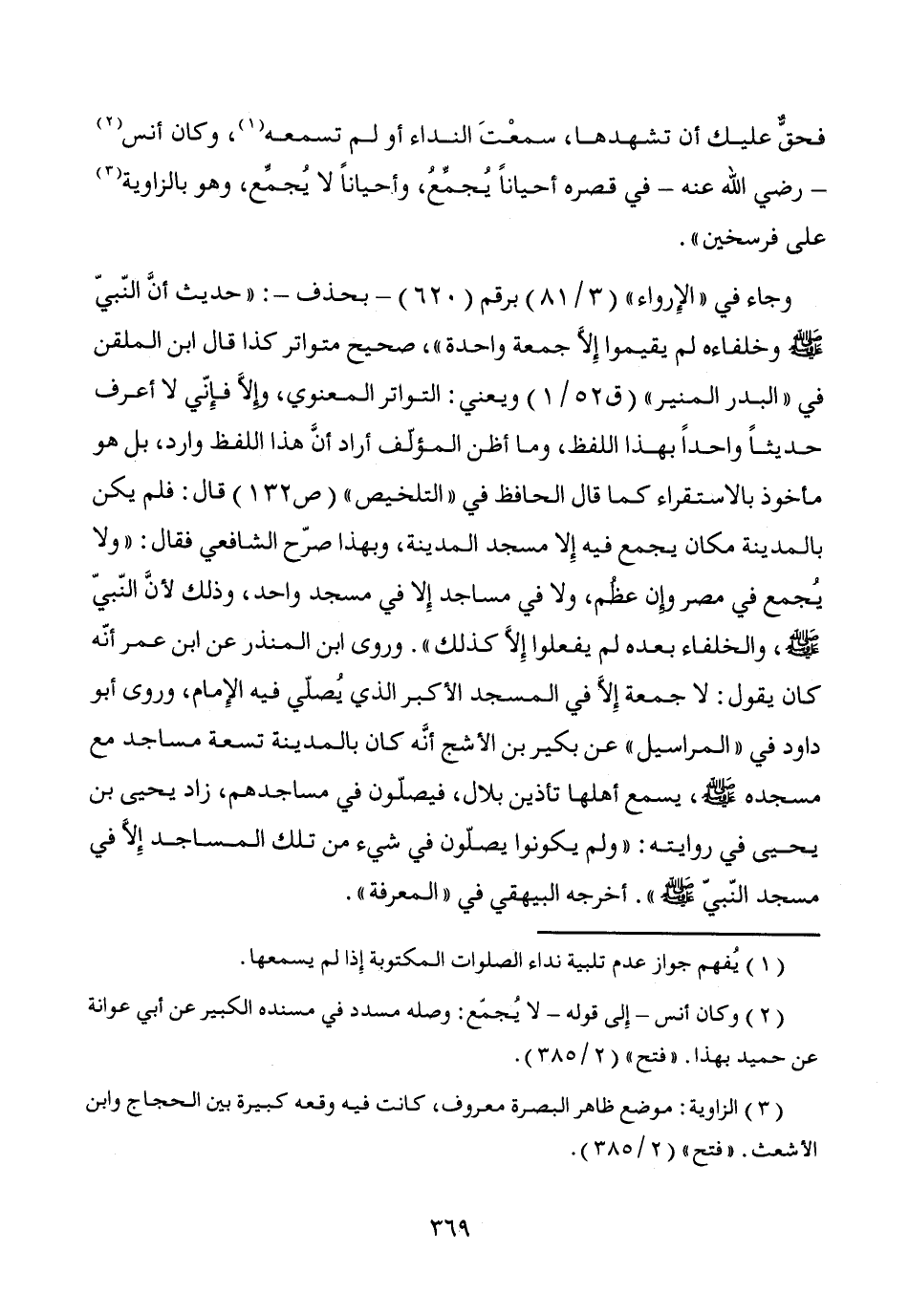 وجاء في "الإِرواء" (3/ 81) برقم (625) -بحذف-: "حديث أنَّ النّبيّ - صَلَّى اللَّهُ عَلَيْهِ وَسَلَّمَ - وخلفاءه لم يقيموا إلاَّ جمعة واحدة"، صحيح متواتر كذا قال ابن الملقن في "البدر المنير" (ق 52/ 1) ويعني: التواتر المعنوي، وإلاَّ فإِنّي لا أعرف حديثاً واحداً بهذا اللفظ، وما أظن المؤلّف أراد أنَّ هذا اللفظ وارد، بل هو مأخوذ بالاستقراء كما قال الحافظ في "التلخيص" (ص 132) قال: فلم يكن بالمدينة مكان يجمع فيه إِلا مسجد المدينة، وبهذا صرّح الشافعي فقال: "ولا يُجمع في مصر وإن عظُم، ولا في مساجد إِلا في مسجد واحد، وذلك لأنَّ النّبيّ - صَلَّى اللَّهُ عَلَيْهِ وَسَلَّمَ -، والخلفاء بعده لم يفعلوا إلاَّ كذلك". وروى ابن المنذر عن ابن عمر أنّه كان يقول: لا جمعة إلاَّ في المسجد الأكبر الذي يُصلّي فيه الإِمام، وروى أبو داود في "المراسيل" عن بكير بن الأشج أنَّه كان بالمدينة تسعة مساجد مع مسجده - صَلَّى اللَّهُ عَلَيْهِ وَسَلَّمَ -، يسمع أهلها تأذين بلال، فيصلّون في مساجدهم، زاد يحيى بن يحيى في روايته: "ولم يكونوا يصلّون في شيء من تلك المساجد إلاَّ في مسجد النّبيّ - صَلَّى اللَّهُ عَلَيْهِ وَسَلَّمَ -". أخرجه البيهقي في "المعرفة".