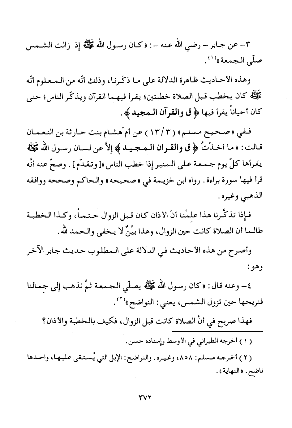 3 - عن جابر -رضي الله عنه-: "كان رسول الله - صَلَّى اللَّهُ عَلَيْهِ وَسَلَّمَ - إِذ زالت الشمس صلّى الجمعة" (¬1).