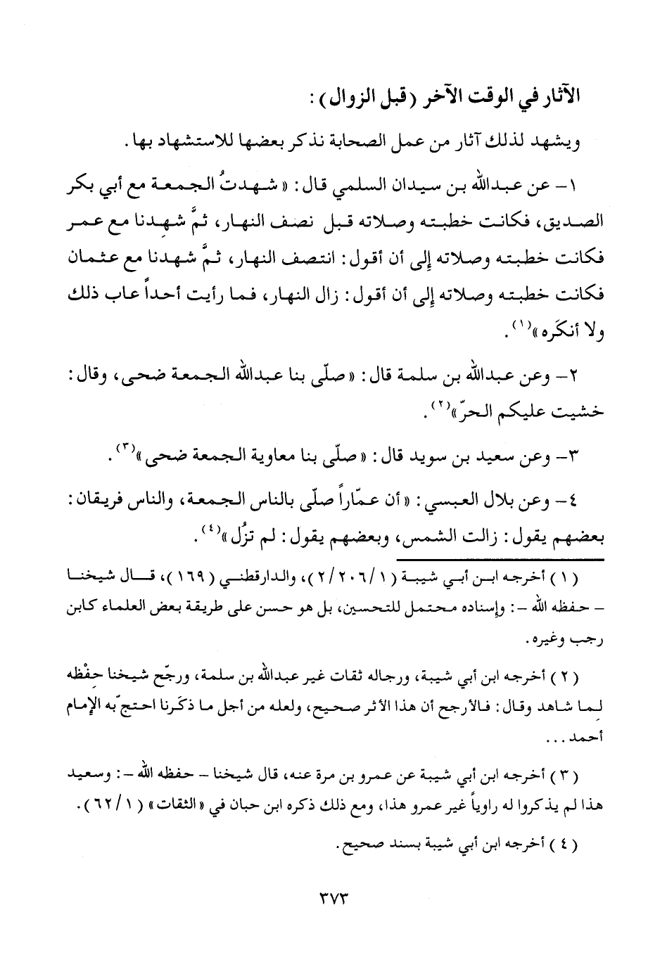 1 - عن عبد الله بن سيدان السلمي قال: "شهدتُ الجمعة مع أبي بكر الصديق، فكانت خطبته وصلاته قبل نصف النهار، ثمَّ شهِدنا مع عمر فكانت خطبته وصلاته إِلى أن أقول: انتصف النهار، ثمَّ شهدنا مع عثمان فكانت خطبته وصلاته إِلى أن أقول: زال النهار، فما رأيت أحداً عاب ذلك ولا أنكَره" (¬1).