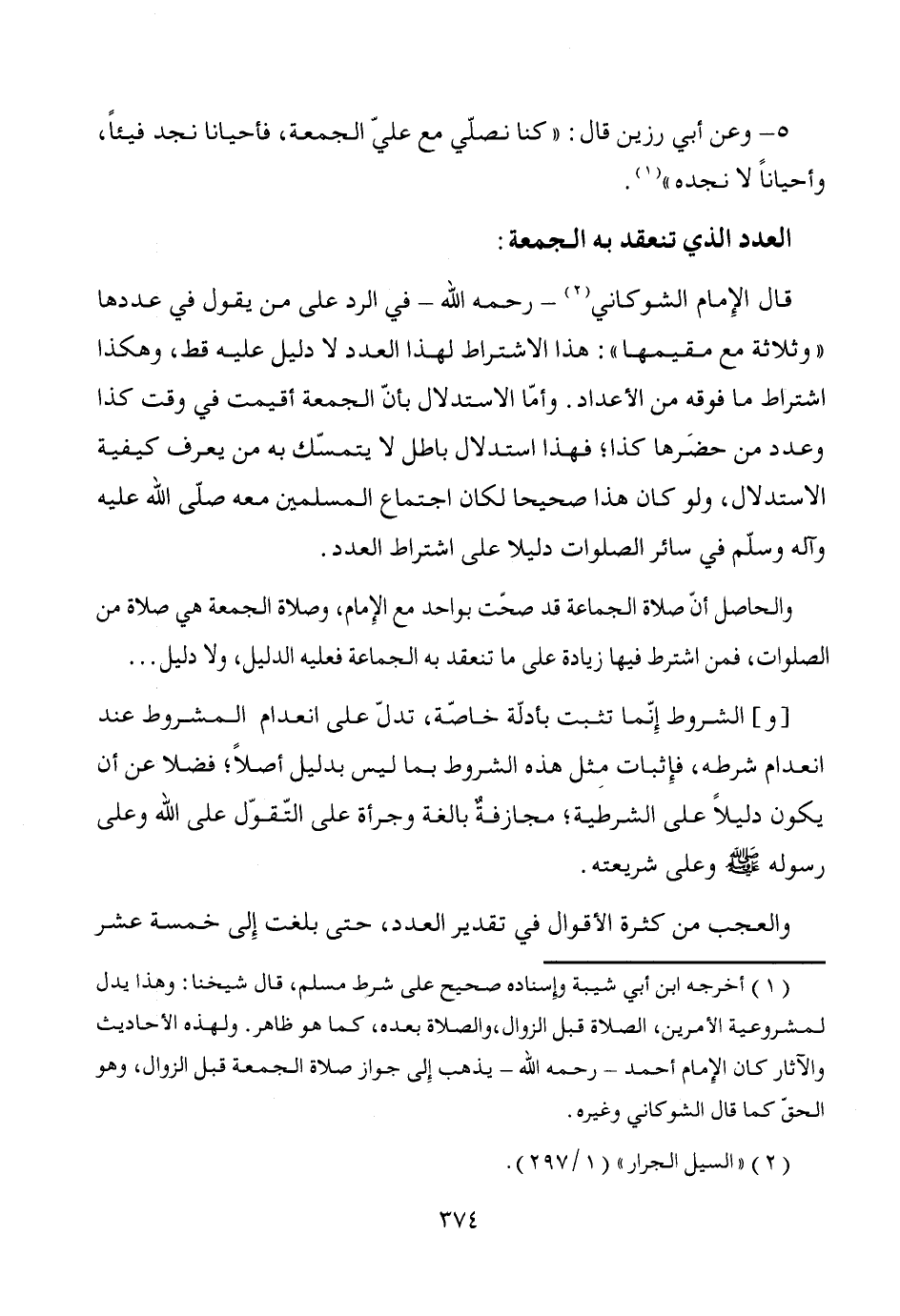 قال الإِمام الشوكاني (¬2) -رحمه الله- في الرد على من يقول في عددها "وثلاثة مع مقيمها": هذا الاشتراط لهذا العدد لا دليل عليه قط، وهكذا اشتراط ما فوقه من الأعداد. وأمّا الاستدلال بأنّ الجمعة أقيمت في وقت كذا وعدد من حضَرها كذا؛ فهذا استدلال باطل لا يتمسّك به من يعرف كيفية الاستدلال، ولو كان هذا صحيحا لكان اجتماع المسلمين معه صلّى الله عليه وآله وسلّم في سائر الصلوات دليلا على اشتراط العدد.