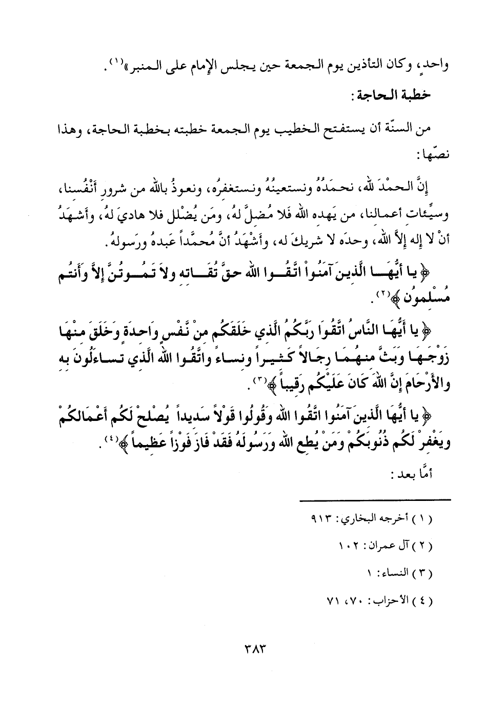 من السنّة أن يستفتح الخطيب يوم الجمعة خطبته بخطبة الحاجة، وهذا نصّها: إِنَّ الحمْدَ لله، نحمَدُهُ ونستعينُهُ ونستغفِرُه، ونعوذُ بالله من شرورِ أَنْفسِنا، وسيِّئاتِ أعمالِنا، من يَهدِه الله فَلا مُضِلَّ لهُ، ومَن يُضْلل فلا هاديَ له، وأَشهَدُ أنْ لا إِله إلاَّ الله، وحدَه لا شريكَ له، وأَشْهَدُ أنَّ مُحمَّداً عَبدهُ ورَسولهُ.
