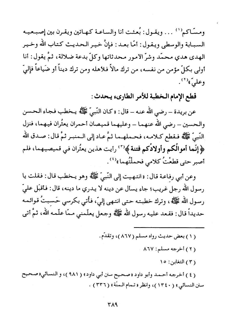 عن بريدة -رضي الله عنه- قال: "كان النّبيّ - صَلَّى اللَّهُ عَلَيْهِ وَسَلَّمَ - يخطب فجاء الحسن والحسين -رضي الله عنهما- وعليهما قميصان أحمران يعثُران فيهما، فنزل النّبيّ - صَلَّى اللَّهُ عَلَيْهِ وَسَلَّمَ - فقطع كلامه، فحملهما ثمَّ عاد إِلى المنبر ثمَّ قال: صدق الله {إِنّما أموالُكم وأولادُكم فتنة} (¬3) رأيت هذين يعثُران في قميصيهما، فلم أصبر حتى قطعْتُ كلامي فحملْتُهما" (¬4).