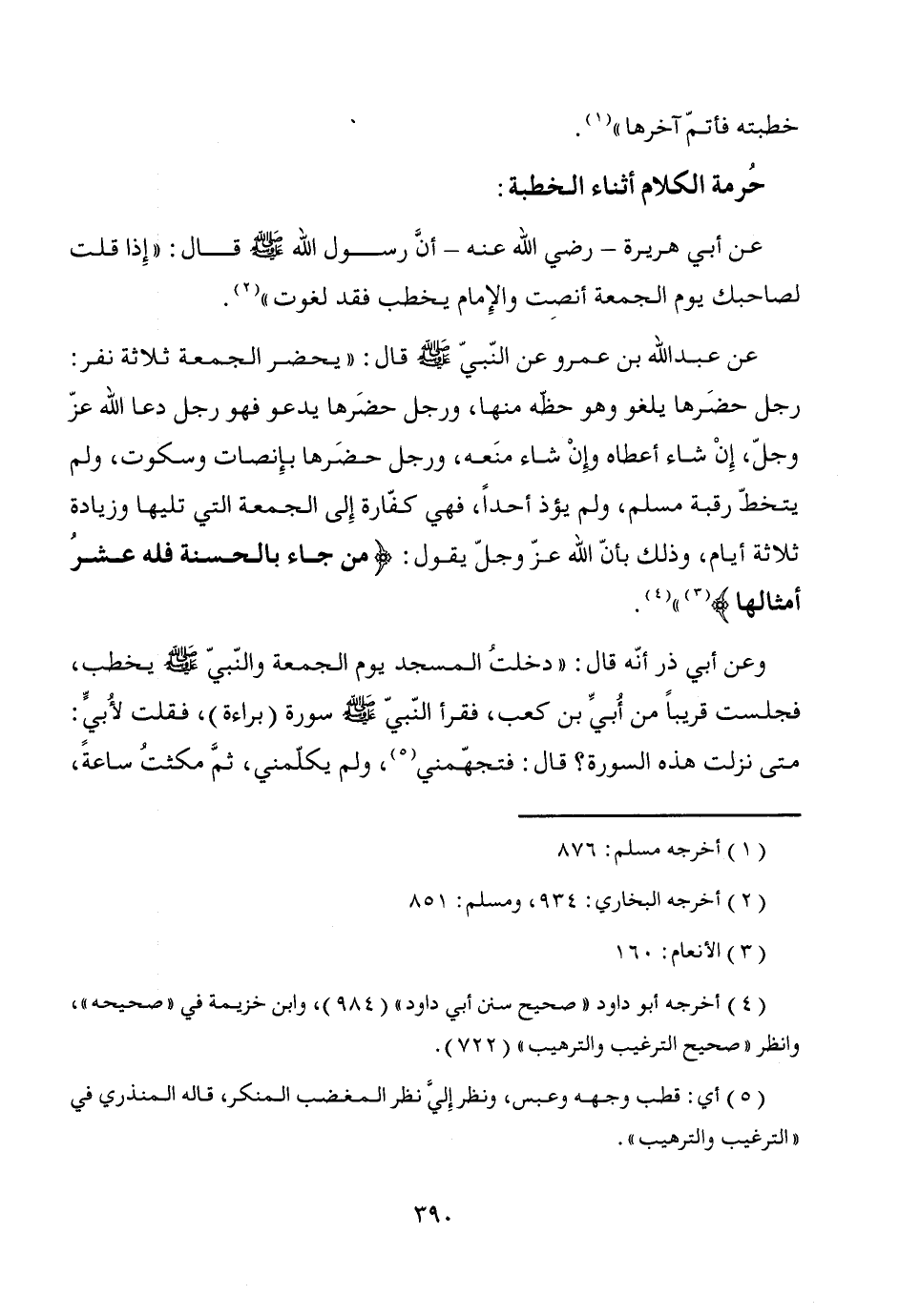 عن أبي هريرة -رضي الله عنه- أنَّ رسول الله - صَلَّى اللَّهُ عَلَيْهِ وَسَلَّمَ - قال: "إِذا قلت لصاحبك يوم الجمعة أنصِت والإِمام يخطب فقد لغوت" (¬2).