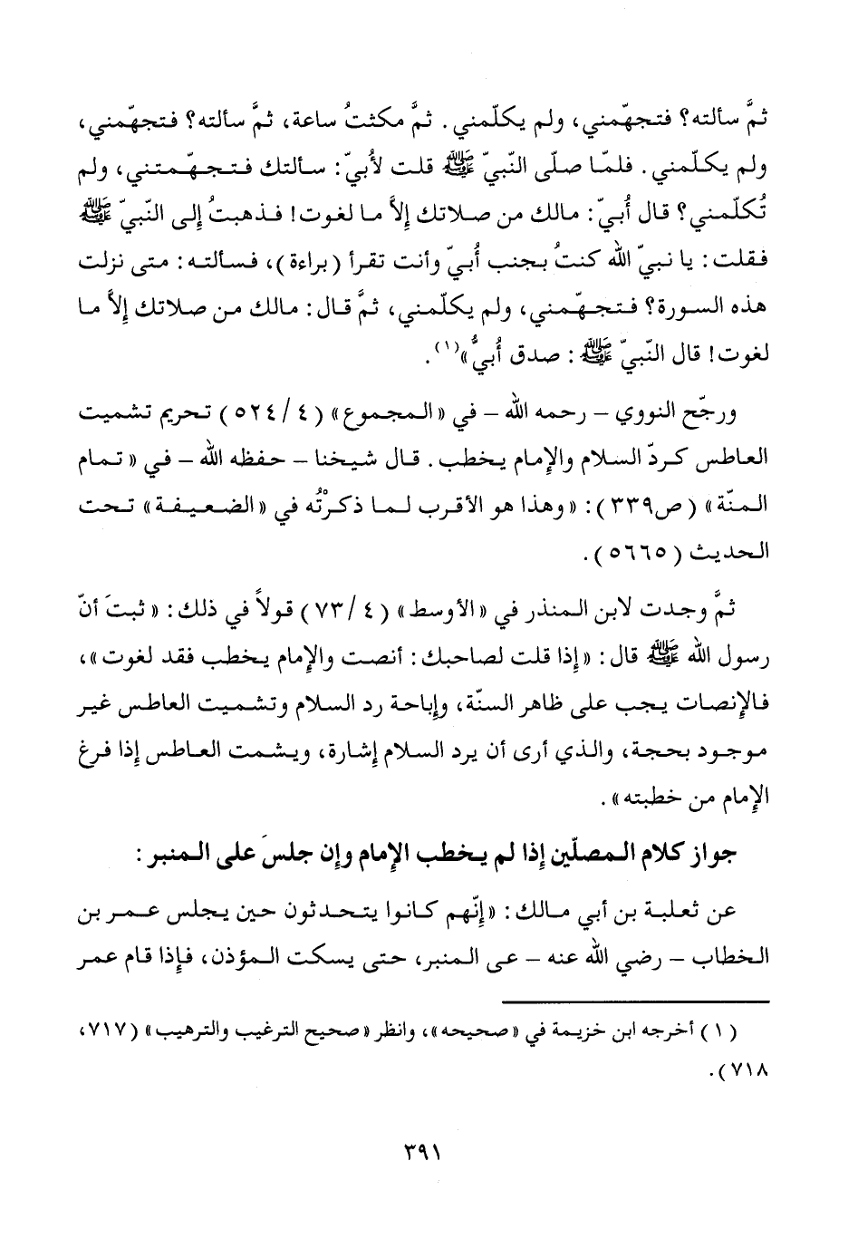 ثمَّ وجدت لابن المنذر في "الأوسط" (4/ 73) قولاً في ذلك: "ثبتَ أنّ رسول الله - صَلَّى اللَّهُ عَلَيْهِ وَسَلَّمَ - قال: "إِذا قلت لصاحبك: أنصت والإِمام يخطب فقد لغوت"، فالإِنصات يجب على ظاهر السنّة، وإباحة رد السلام وتشميت العاطس غير موجود بحجة، والذي أرى أن يرد السلام إِشارة، ويشمت العاطس إِذا فرغ الإِمام من خطبته".
