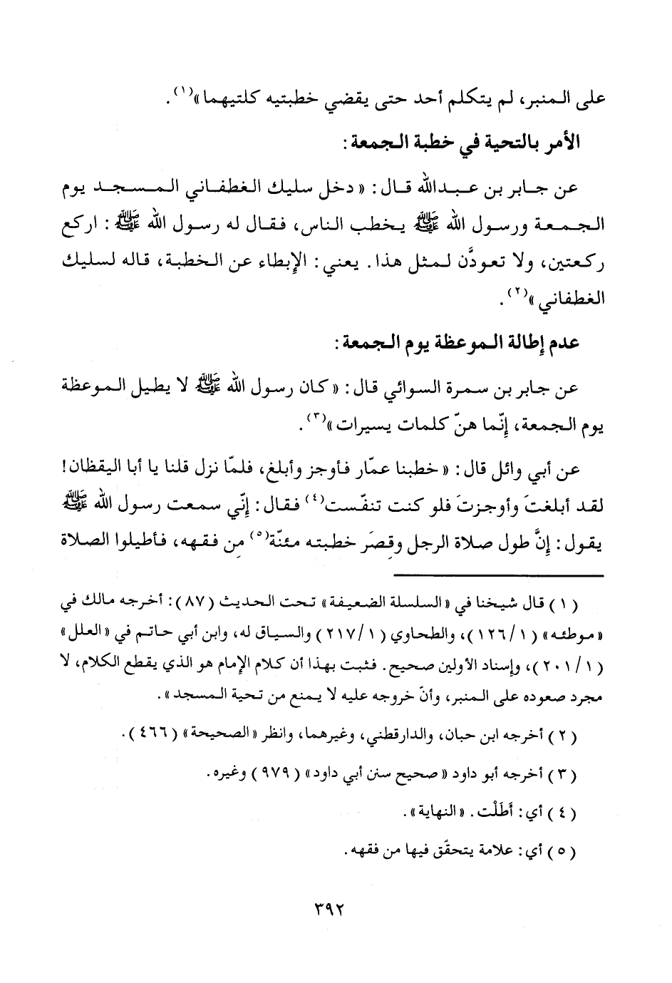 (¬1) قال شيخنا في "السلسلة الضعيفة" تحت الحديث (87): أخرجه مالك في "موطئه" (1/ 126)، والطحاوي (1/ 217) والسياق له، وابن أبي حاتم في "العلل" (1/ 201)، وإسناد الأولين صحيح. فثبت بهذا أن كلام الإِمام هو الذي يقطع الكلام، لا مجرد صعوده على المنبر، وأنّ خروجه عليه لا يمنع من تحية المسجد".