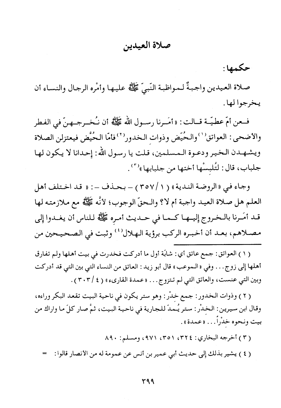 وجاء في "الروضة الندية" (1/ 357) -بحذف-: "قد اختلف أهل العلم هل صلاة العيد واجبة أم لا؟ والحقّ الوجوب، لأنَّه - صَلَّى اللَّهُ عَلَيْهِ وَسَلَّمَ - مع ملازمته لها قد أمَرنا بالخروج إِليها كما في حديث أمرِه - صَلَّى اللَّهُ عَلَيْهِ وَسَلَّمَ - للناس أن يغدوا إِلى مصلاهم، بعد أن أخبره الركب برؤية الهلال (¬4) وثبت في الصحيحين من