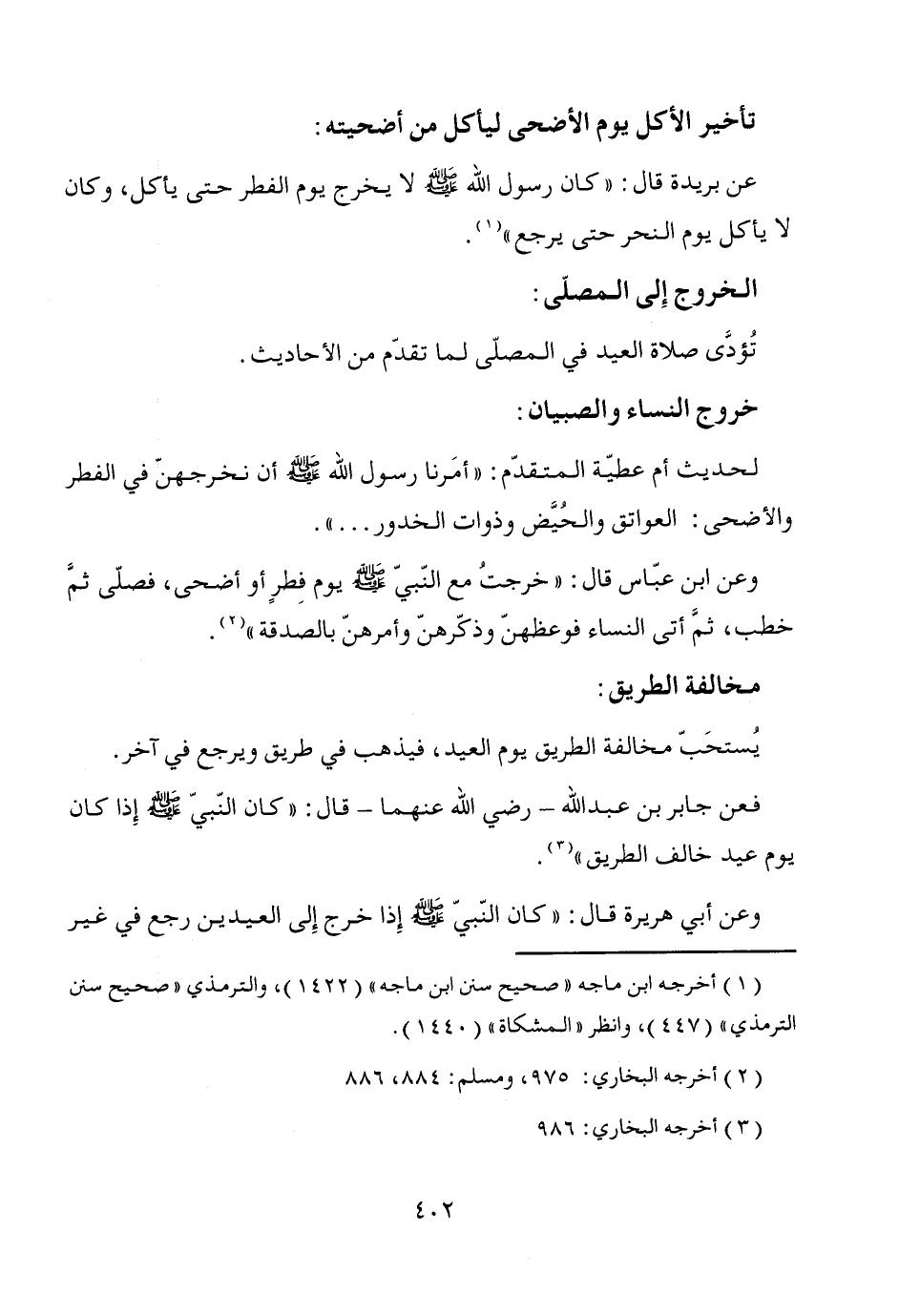 وعن أبي هريرة قال: "كان النّبيّ - صَلَّى اللَّهُ عَلَيْهِ وَسَلَّمَ - إِذا خرج إِلى العيدين رجع في غير