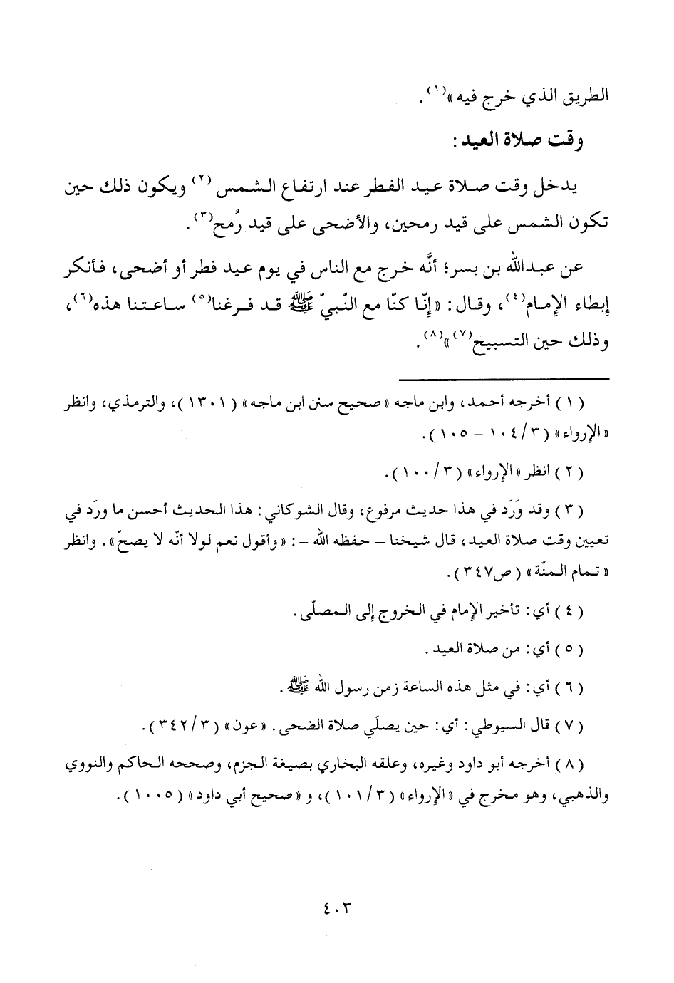 (¬3) وقد وَرَد في هذا حديث مرفوع، وقال الشوكاني: هذا الحديث أحسن ما ورَد في تعيين وقت صلاة العيد، قال شيخنا -حفظه الله-: "وأقول نعم لولا أنّه لا يصحّ". وانظر "تمام المنّة" (ص 347).