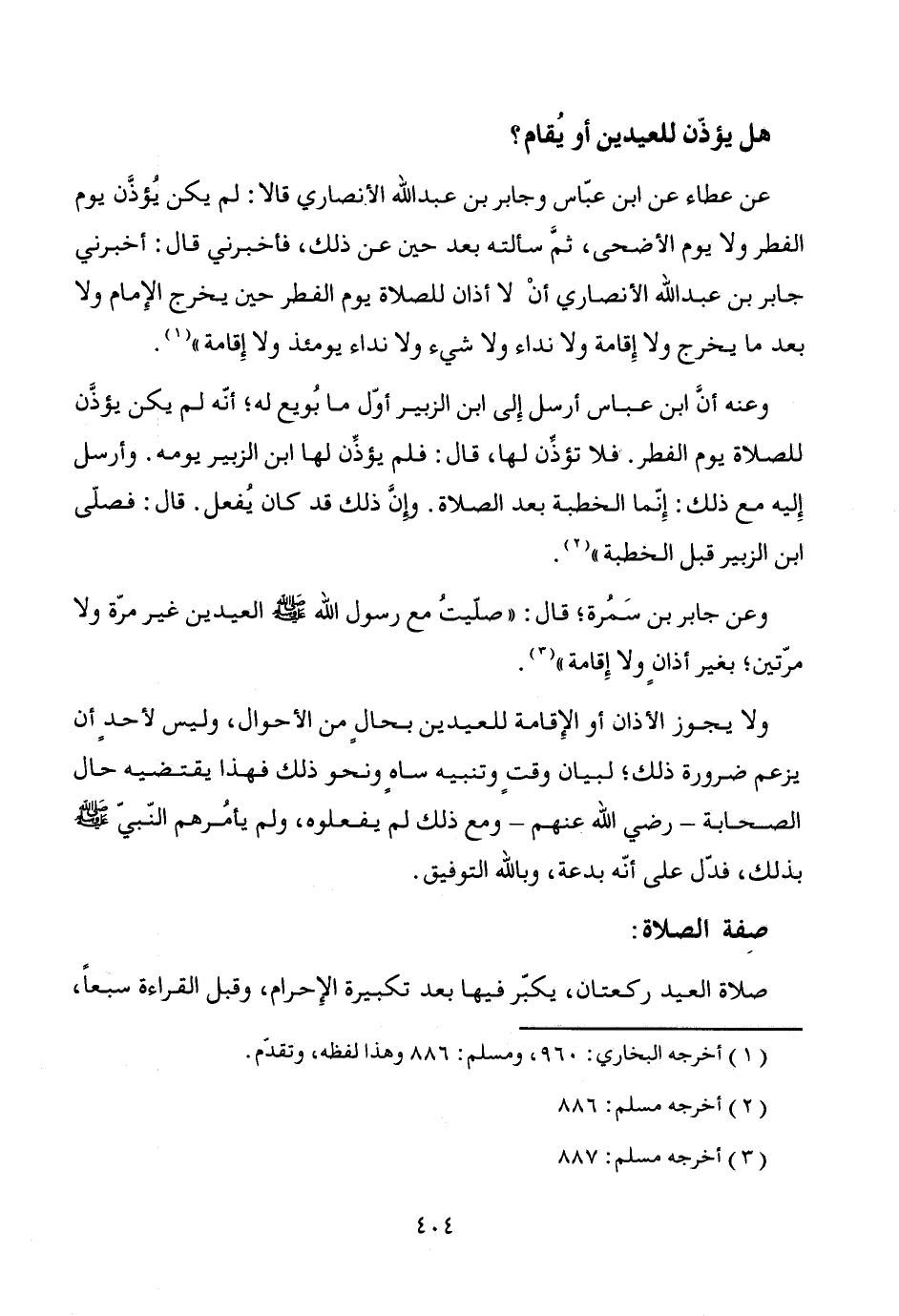 عن عطاء عن ابن عبّاس وجابر بن عبد الله الأنصاري قالا: لم يكن يُؤذَّن يوم الفطر ولا يوم الأضحى، ثمَّ سألته بعد حين عن ذلك، فأخبرني قال: أخبرني جابر بن عبد الله الأنصاري أنْ لا أذان للصلاة يوم الفطر حين يخرج الإِمام ولا بعد ما يخرج ولا إِقامة ولا نداء ولا شيء ولا نداء يومئذ ولا إِقامة" (¬1).