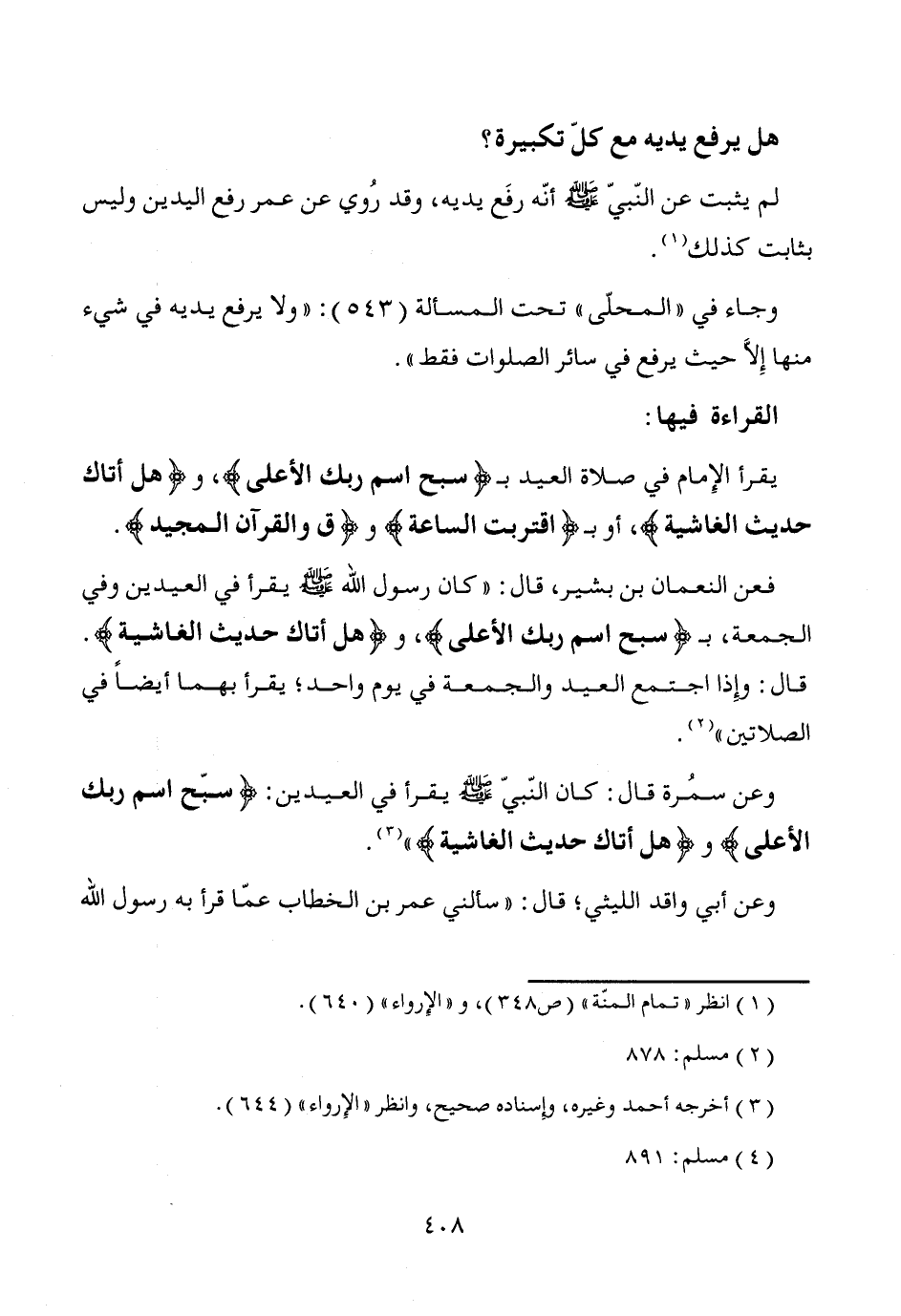 يقرأ الإِمام في صلاة العيد بـ {سبح اسم ربك الأعلى}، و {هل أتاك حديث الغاشية}، أو بـ {اقتربت الساعة} و {ق والقرآن المجيد}.