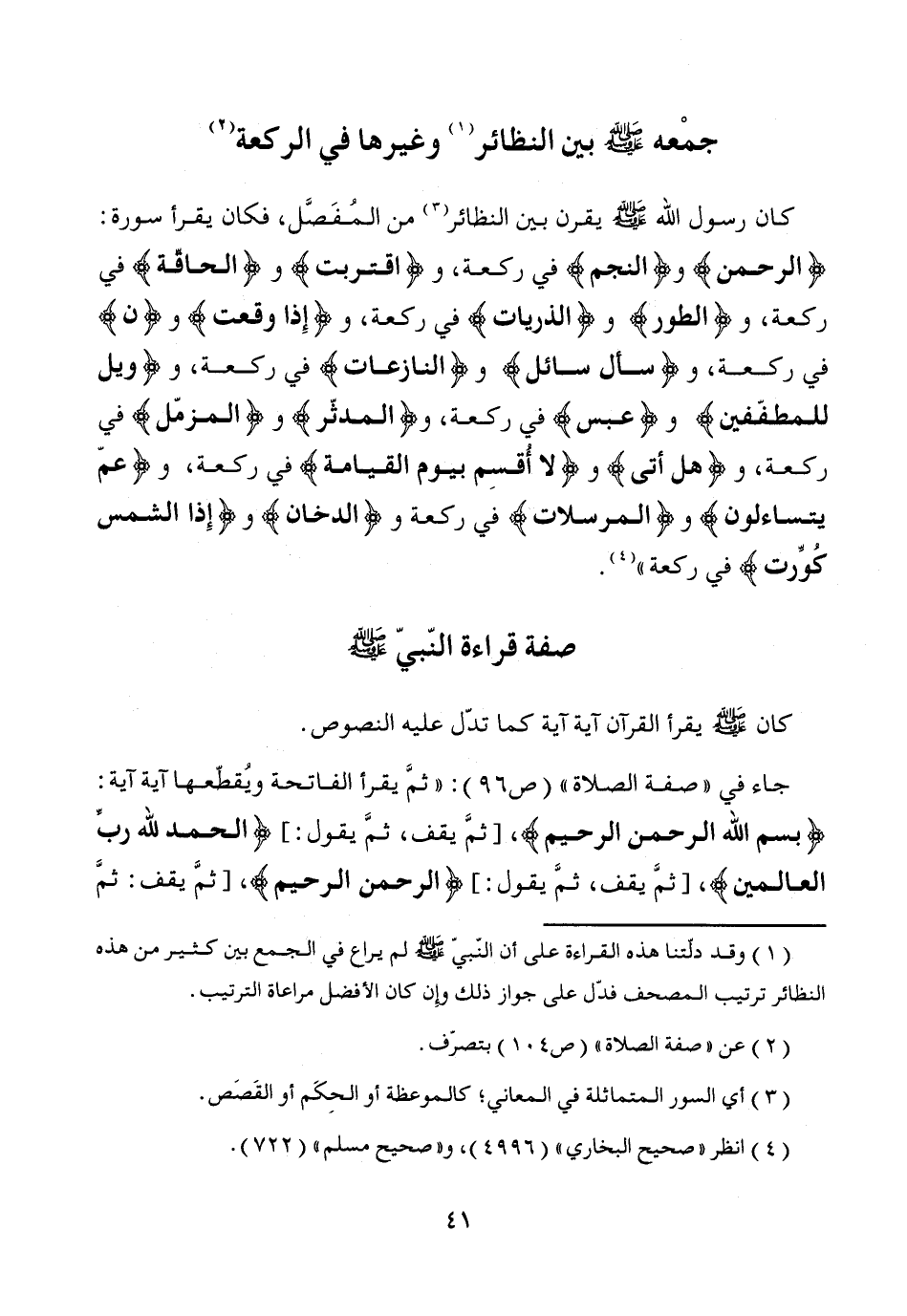 كان رسول الله - صَلَّى اللَّهُ عَلَيْهِ وَسَلَّمَ - يقرن بين النظائر (¬3) من المُفَصَّل، فكان يقرأ سورة: {الرحمن} و {النجم} في ركعة، و {اقتربت} و {الحاقّة} في ركعة، و {الطور} و {الذريات} في ركعة، و {إِذا وقعت} و {ن} في ركعة، و {سأل سائل} و {النازعات} في ركعة، و {ويل للمطفّفين} و {عبس} في ركعة، و {المدثّر} و {المزمّل} في ركعة، و {هل أتى} و {لا أُقسِم بيوم القيامة} في ركعة، و {عمّ يتساءلون} و {المرسلات} في ركعة و {الدخان} و {إِذا الشمس كُوِّرت} في ركعة" (¬4).