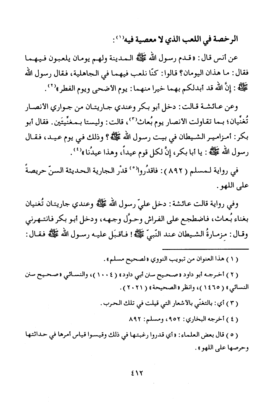 عن أنس قال: "قدم رسول الله - صَلَّى اللَّهُ عَلَيْهِ وَسَلَّمَ - المدينة ولهم يومان يلعبون فيهما فقال: ما هذان اليومان؟ قالوا: كنّا نلعب فيهما في الجاهلية، فقال رسول الله - صَلَّى اللَّهُ عَلَيْهِ وَسَلَّمَ -: إن الله قد أبدلكم بهما خيرا منهما: يوم الأضحى ويوم الفطر" (¬2).