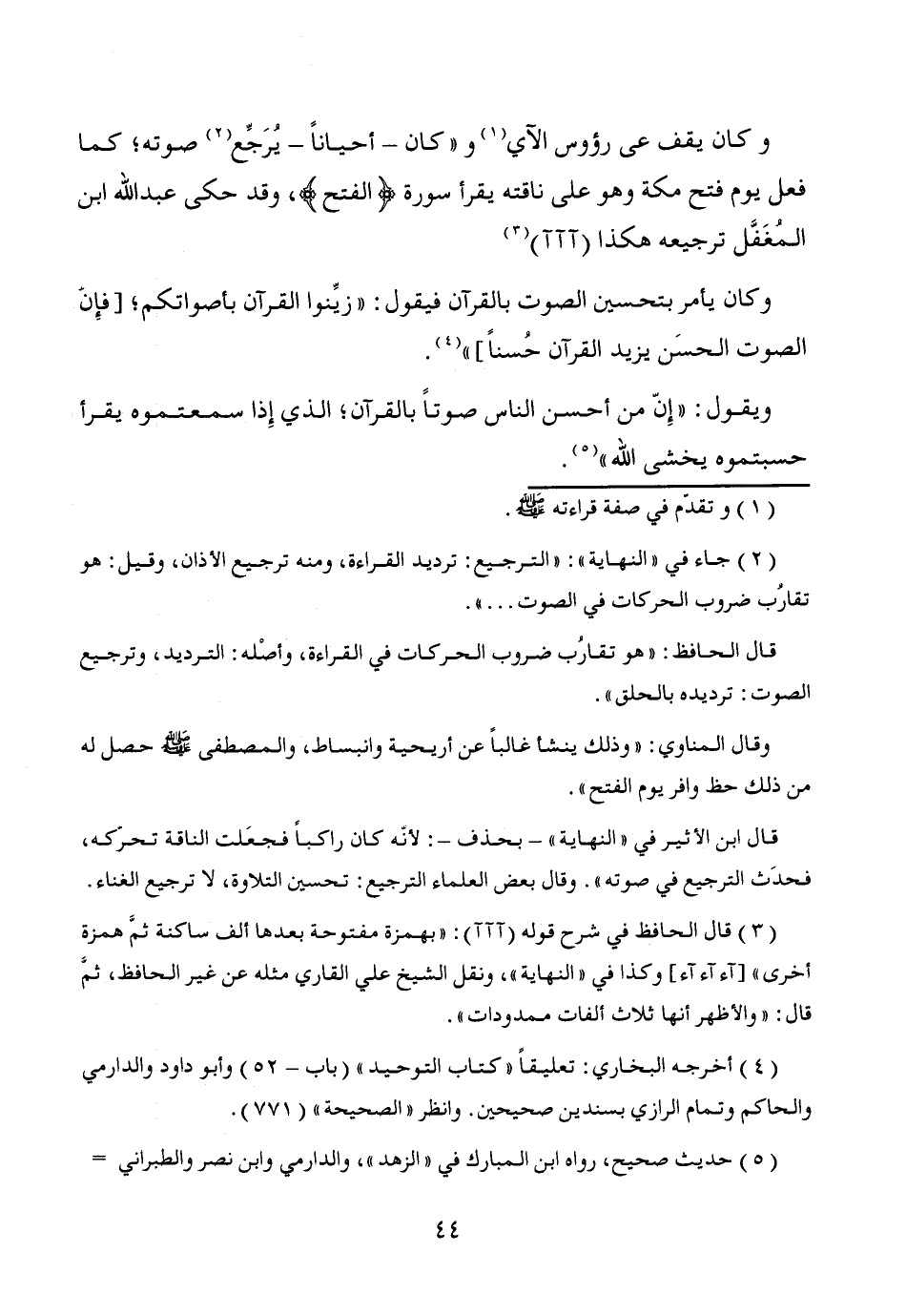 قال ابن الأثير في "النهاية" -بحذف-: لأنه كان راكباً فجعَلت الناقة تحرّكه، فحدَث الترجيع في صوته". وقال بعض العلماء الترجيع: تحسين التلاوة، لا ترجيع الغناء.