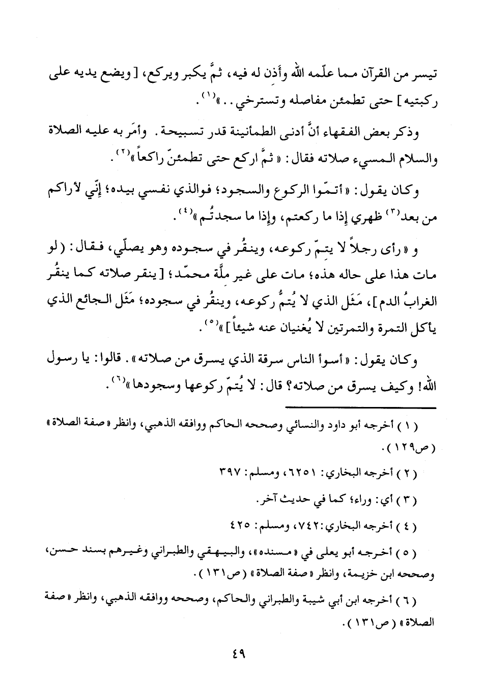 و"رأى رجلاً لا يتِمّ ركوعه، وينقُر في سجوده وهو يصلّي، فقال: [لو مات هذا على حاله هذه؛ مات على غير مِلَّة محمّد؛ [ينقر صلاته كما ينقُر الغرابُ الدم]، مَثَل الذي لا يُتمّ ركوعه، وينقُر في سجوده، مَثَل الجائع الذي يأكل التمرة والتمرتين لا يُغنيان عنه شيئاً] " (¬5).