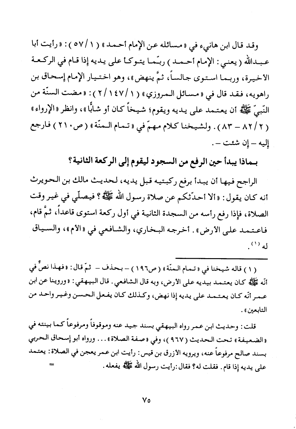 (¬1) قاله شيخنا في "تمام المنّة" (ص 196) -بحذف- ثم قال: "فهذا نصٌّ في أنه - صَلَّى اللَّهُ عَلَيْهِ وَسَلَّمَ - كان يعتمد بيديه على الأرض، وبه قال الشافعي. قال البيهقي: "وروينا عن ابن عمر أنّه كان يعتمد على يديه إِذا نهض، وكذلك كان يفعل الحسن وغير واحد من التابعين".