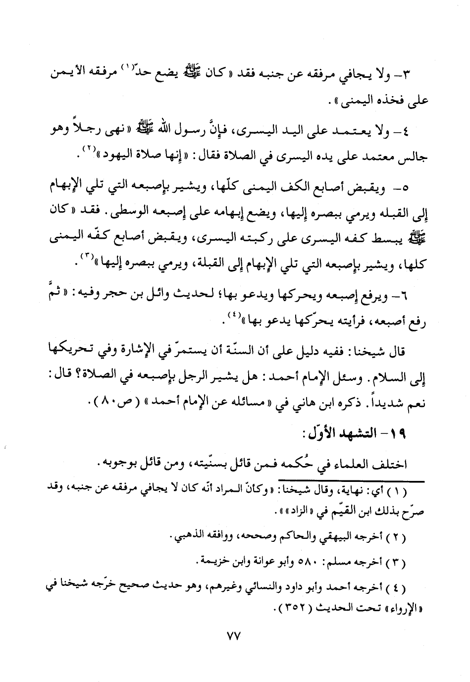 5 - ويقبض أصابع الكف اليمنى كلّها، ويشير بإِصبعه التي تلي الإِبهام إِلى القبله ويرمي ببصره إِليها، ويضع إِبهامه على إِصبعه الوسطى. فقد "كان - صَلَّى اللَّهُ عَلَيْهِ وَسَلَّمَ - يبسط كفه اليسرى على ركبته اليسرى، ويقبض أصابع كفّه اليمنى كلها، ويشير بإِصبعه التي تلي الإِبهام إِلى القبلة، ويرمي ببصره إِليها" (¬3).