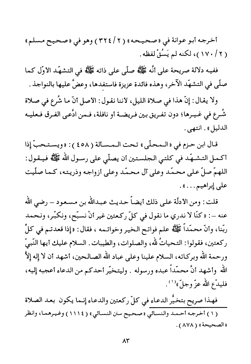 قلت: ومن الأدلة على ذلك أيضاً حديث عبد الله بن مسعود -رضي الله عنه-: "كنّا لا ندري ما نقول في كلّ ركعتين غير أنْ نسبّح، ونكبّر، ونحمد ربّنا، وأنّ محمّداً - صَلَّى اللَّهُ عَلَيْهِ وَسَلَّمَ - علم فواتح الخير وخواتمه، فقال: "إِذا قعدتم في كل ركعتين، فقولوا: التحياتُ لله، والصلوات، والطيبات. السلام عليك أيها النّبيّ ورحمة الله وبركاته، السلام علينا وعلى عباد الله الصالحين، أشهد أن لا إله إلاَّ الله وأشهد أنَّ محمّداً عبده ورسوله. وليتخيّر أحدكم من الدعاء أعجبه إِليه، فليدْع الله عزّ وجلّ" (¬1).