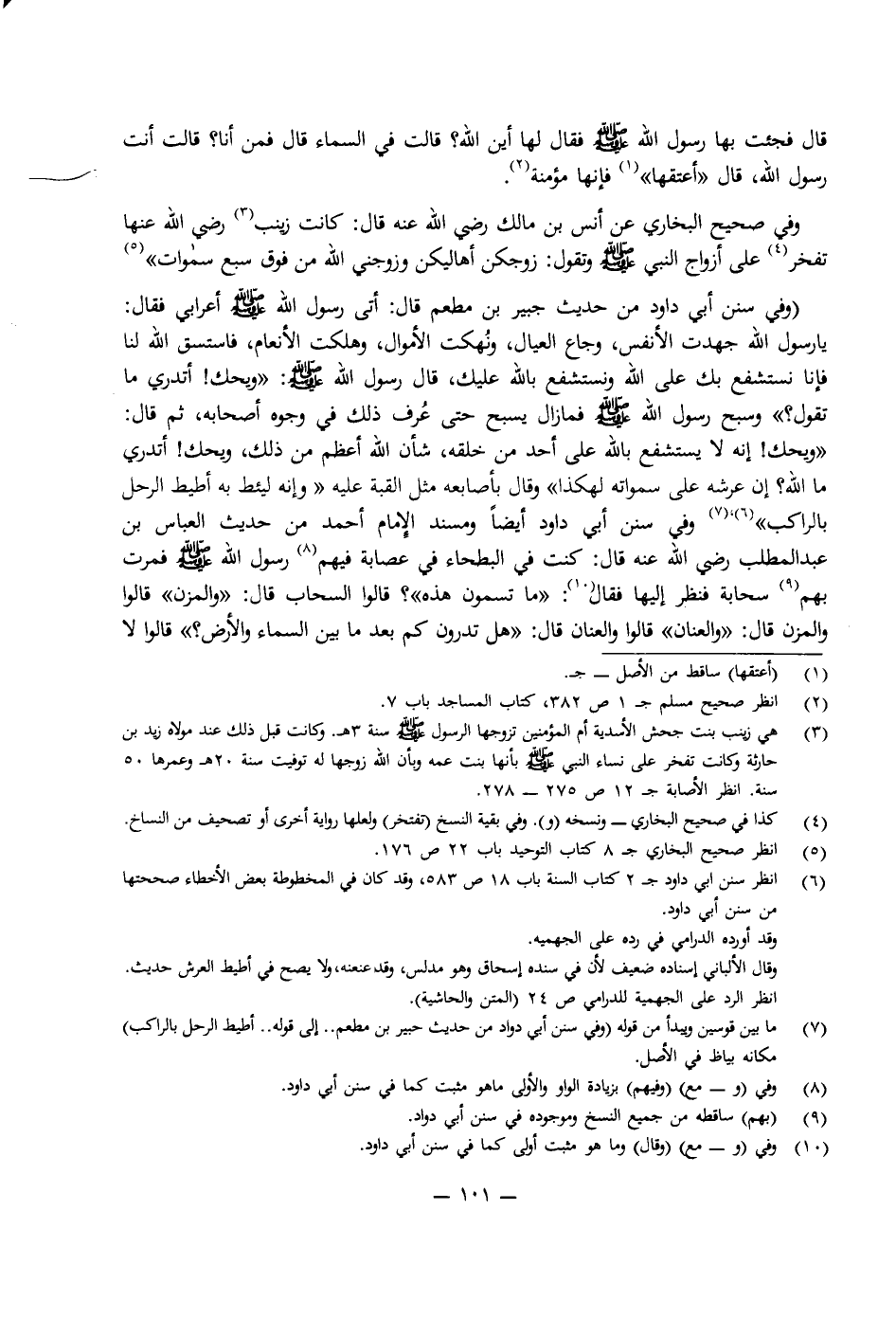 وَفِي سُنَنِ أَبِي دَاوُدَ مِنْ حَدِيثِ جُبَيْرِ بْنِ مُطْعِمٍ قَالَ: «أَتَى رَسُولَ اللَّهِ صَلَّى اللَّهُ عَلَيْهِ وَسَلَّمَ أَعْرَابِيٌّ فَقَالَ: يَا رَسُولَ اللَّهِ جَهِدَتِ الْأَنْفُسُ، وَجَاعَ الْعِيَالُ، وَنُهِكَتِ الْأَمْوَالُ، وَهَلَكَتِ الْأَنْعَامُ، فَاسْتَسْقِ اللَّهَ لَنَا فَإِنَّا نَسْتَشْفِعُ بِكَ عَلَى اللَّهِ وَنَسْتَشْفِعُ بِاللَّهِ عَلَيْكَ، قَالَ رَسُولُ اللَّهِ صَلَّى اللَّهُ عَلَيْهِ وَسَلَّمَ: " وَيْحَكَ! أَتُدْرِي مَا تَقُولُ؟ " وَسَبَّحَ رَسُولُ اللَّهِ صَلَّى اللَّهُ عَلَيْهِ وَسَلَّمَ فَمَا زَالَ يُسَبِّحُ حَتَّى عُرِفَ ذَلِكَ فِي وُجُوهِ أَصْحَابِهِ، ثُمَّ قَالَ: " وَيْحَكَ! إِنَّهُ لَا يُسْتَشْفَعُ بِاللَّهِ عَلَى أَحَدٍ مِنْ خَلْقِهِ، شَأْنُ اللَّهِ أَعْظَمُ مِنْ ذَلِكَ، وَيْحَكَ! أَتُدْرِي مَا اللَّهُ؟ إِنَّ عَرْشَهُ عَلَى سَمَاوَاتِهِ لَهَكَذَا " وَقَالَ بِأَصَابِعِهِ مِثْلَ الْقُبَّةِ عَلَيْهِ " وَإِنَّهُ لَيَئِطُّ بِهِ أَطِيطَ الرَّحْلِ بِالرَّاكِبِ» ". وَفِي سُنَنِ أَبِي دَاوُدَ أَيْضًا وَمُسْنَدِ الْإِمَامِ أَحْمَدَ مِنْ حَدِيثِ الْعَبَّاسِ بْنِ عَبْدِ الْمُطَّلِبِ رَضِيَ اللَّهُ عَنْهُ قَالَ: «كُنْتُ فِي الْبَطْحَاءِ فِي عِصَابَةٍ فِيهِمْ رَسُولُ اللَّهِ صَلَّى اللَّهُ عَلَيْهِ وَسَلَّمَ فَمَرَّتْ بِهِمْ سَحَابَةٌ فَنَظَرَ إِلَيْهَا فَقَالَ: " مَا تُسَمُّونَ هَذِهِ؟ " قَالُوا: السَّحَابُ قَالَ: " وَالْمُزْنُ " قَالُوا: وَالْمُزْنُ قَالَ: " وَالْعَنَانُ " قَالُوا: وَالْعَنَانُ قَالَ: " هَلْ تَدْرُونَ كَمْ بُعْدُ مَا بَيْنَ السَّمَاءِ وَالْأَرْضِ؟ " قَالُوا: لَا