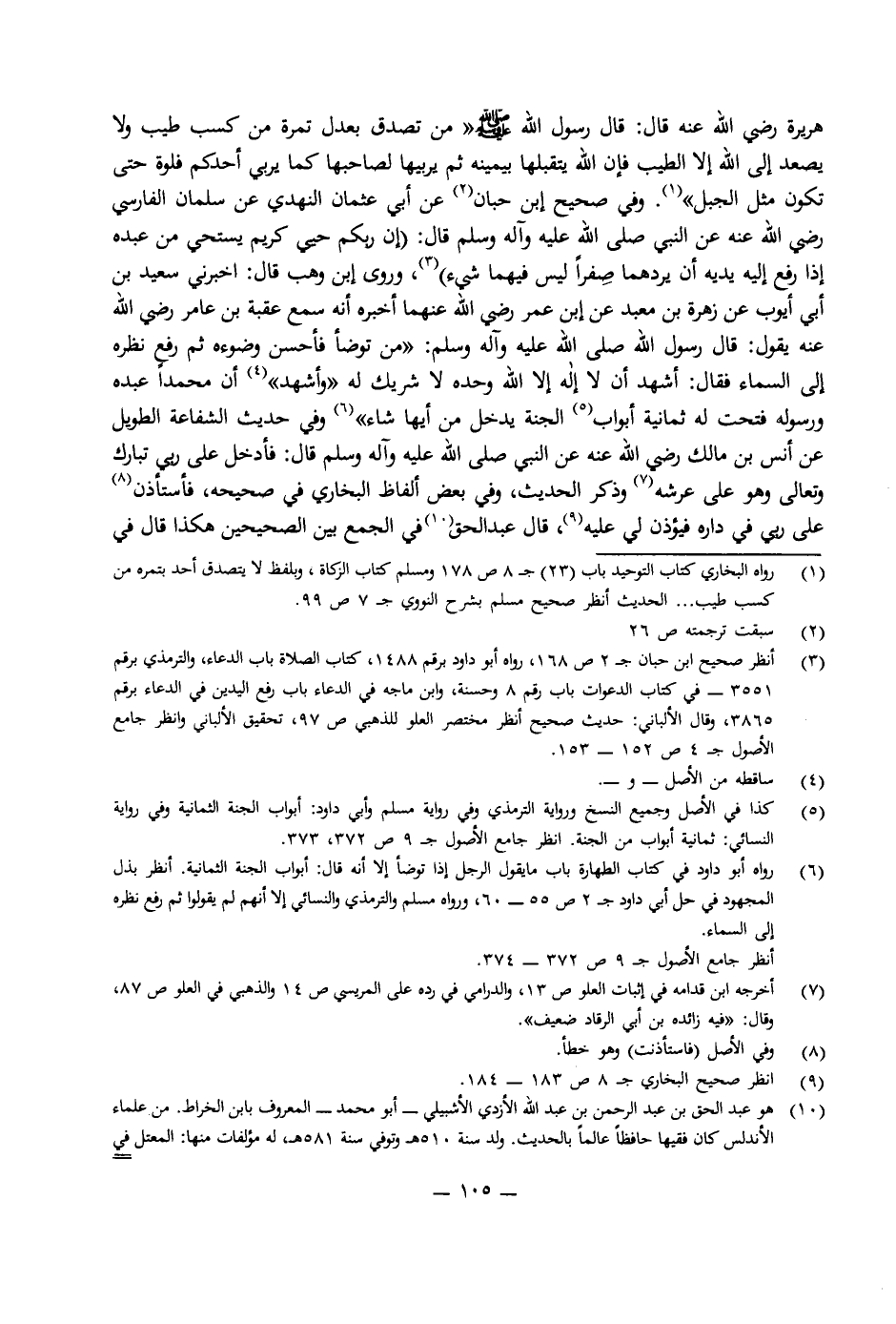 هُرَيْرَةَ رَضِيَ اللَّهُ عَنْهُ قَالَ: قَالَ رَسُولُ اللَّهِ صَلَّى اللَّهُ عَلَيْهِ وَسَلَّمَ " «مَنْ تَصَدَّقَ بِعَدْلِ تَمْرَةٍ مِنْ كَسْبٍ طَيِّبٍ وَلَا يَصْعَدُ إِلَى اللَّهِ إِلَّا الطَّيِّبُ فَإِنَّ اللَّهَ يَتَقَبَّلُهَا بِيَمِينِهِ ثُمَّ يُرْبِيهَا لِصَاحِبِهَا كَمَا يُرَبِّي أَحَدُكُمْ فَلُوَّهُ حَتَّى تَكُونَ مِثْلَ الْجَبَلِ» ". وَفِي صَحِيحِ ابْنِ حِبَّانَ عَنْ أَبِي عُثْمَانَ النَّهْدَيِّ عَنْ سَلْمَانَ الْفَارِسِيِّ رَضِيَ اللَّهُ عَنْهُ عَنِ النَّبِيِّ صَلَّى اللَّهُ عَلَيْهِ وَآلِهِ وَسَلَّمَ قَالَ: ( «إِنَّ رَبَّكُمْ حَيِيٌّ كَرِيمٌ يَسْتَحِي مِنْ عَبْدِهِ إِذَا رَفَعَ إِلَيْهِ يَدَيْهِ أَنْ يَرُدَّهُمَا صِفْرًا لَيْسَ فِيهِمَا شَيْءٌ» ) ، وَرَوَى ابْنُ وَهْبٍ قَالَ: أَخْبَرَنِي سَعِيدُ بْنُ أَبِي أَيُّوبَ عَنْ زَهْرَةَ بْنِ مَعْبَدٍ عَنِ ابْنِ عُمَرَ رَضِيَ اللَّهُ عَنْهُمَا أَخْبَرَهُ أَنَّهُ سَمِعَ عُقْبَةَ بْنَ عَامِرٍ رَضِيَ اللَّهُ عَنْهُ يَقُولُ: قَالَ رَسُولُ اللَّهِ صَلَّى اللَّهُ عَلَيْهِ وَآلِهِ وَسَلَّمَ: " «مَنْ تَوَضَّأَ فَأَحْسَنَ وُضُوءَهُ ثُمَّ رَفَعَ نَظَرَهُ إِلَى السَّمَاءِ فَقَالَ: أَشْهَدُ أَنْ لَا إِلَهَ إِلَّا اللَّهُ وَحْدَهُ لَا شَرِيكَ لَهُ " وَأَشْهَدُ " أَنَّ مُحَمَّدًا عَبْدُهُ وَرَسُولُهُ فُتِحَتْ لَهُ ثَمَانِيَةُ أَبْوَابِ الْجَنَّةِ يَدْخُلُ مِنْ أَيُّهَا شَاءَ» " وَفِي حَدِيثِ الشَّفَاعَةِ الطَّوِيلِ عَنْ أَنَسِ بْنِ مَالِكٍ رَضِيَ اللَّهُ عَنْهُ عَنِ النَّبِيِّ صَلَّى اللَّهُ عَلَيْهِ وَآلِهِ وَسَلَّمَ قَالَ: «فَأَدْخُلُ عَلَى رَبِّي تَبَارَكَ وَتَعَالَى وَهُوَ عَلَى عَرْشِهِ» وَذَكَرَ الْحَدِيثَ، وَفِي بَعْضِ أَلْفَاظِ الْبُخَارِيِّ فِي صَحِيحِهِ، «فَأَسْتَأْذِنُ عَلَى رَبِّي فِي دَارِهِ فَيُؤْذَنُ لِي عَلَيْهِ» ، قَالَ عَبْدُ الْحَقِّ فِي الْجَمْعِ بَيْنَ الصَّحِيحَيْنِ هَكَذَا قَالَ فِي