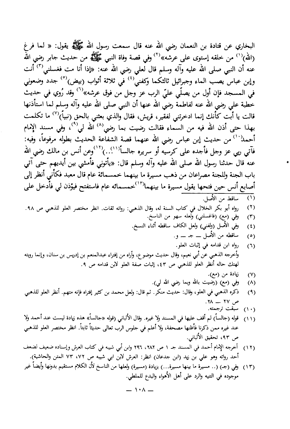 الْبُخَارِيِّ عَنْ قَتَادَةَ بْنِ النُّعْمَانِ رَضِيَ اللَّهُ عَنْهُ قَالَ: سَمِعْتُ رَسُولَ اللَّهِ صَلَّى اللَّهُ عَلَيْهِ وَسَلَّمَ يَقُولُ: " «لَمَّا فَرَغَ اللَّهُ مِنْ خَلْقِهِ اسْتَوَى عَلَى عَرْشِهِ» " وَفِي قِصَّةِ وَفَاةِ النَّبِيِّ صَلَّى اللَّهُ عَلَيْهِ وَسَلَّمَ مِنْ حَدِيثِ جَابِرٍ رَضِيَ اللَّهُ عَنْهُ «أَنَّ النَّبِيَّ صَلَّى اللَّهُ عَلَيْهِ وَآلِهِ وَسَلَّمَ قَالَ لِعَلِيٍّ رَضِيَ اللَّهُ عَنْهُ: " إِذَا أَنَا مِتُّ فَغَسِّلْنِي أَنْتَ وَابْنُ عَبَّاسٍ يَصُبُّ الْمَاءَ وَجِبْرَائِيلُ ثَالِثُكُمَا وَكَفِّنِّي فِي ثَلَاثَةِ أَثْوَابٍ (بِيضٍ) جُدُدٍ وَضَعُونِي فِي الْمَسْجِدِ فَإِنَّ أَوَّلَ مَنْ يُصَلِّي عَلَيَّ الرَّبُّ عَزَّ وَجَلَّ مِنْ فَوْقِ عَرْشِهِ» " وَقَدْ رُوِيَ فِي حَدِيثِ خِطْبَةِ عَلِيٍّ رَضِيَ اللَّهُ عَنْهُ لِفَاطِمَةَ رَضِيَ اللَّهُ عَنْهَا «أَنَّ النَّبِيَّ صَلَّى اللَّهُ عَلَيْهِ وَآلِهِ وَسَلَّمَ لَمَّا اسْتَأْذَنَهَا قَالَتْ: يَا أَبَتِ كَأَنَّكَ إِنَّمَا ادَّخَرْتَنِي لِفَقِيرِ قُرَيْشٍ، فَقَالَ: وَالَّذِي بَعَثَنِي بِالْحَقِّ (نَبِيًّا) مَا تَكَلَّمْتُ بِهَذَا حَتَّى أَذِنَ اللَّهُ فِيهِ مِنَ السَّمَاءِ فَقَالَتْ: رَضِيتُ بِمَا رَضِيَ اللَّهُ لِي» ، وَفِي مُسْنَدِ الْإِمَامِ أَحْمَدَ مِنْ حَدِيثِ ابْنِ عَبَّاسٍ رَضِيَ اللَّهُ عَنْهُمَا قِصَّةُ الشَّفَاعَةِ الْحَدِيثُ بِطُولِهِ مَرْفُوعًا، وَفِيهِ: «فَآتِي رَبِّي عَزَّ وَجَلَّ فَأَجِدُهُ عَلَى كُرْسِيِّهِ أَوْ سَرِيرِهِ جَالِسًا» . وَعَنْ أَنَسِ بْنِ مَالِكٍ رَضِيَ اللَّهُ عَنْهُ، قَالَ: حَدَّثَنَا رَسُولُ اللَّهِ صَلَّى اللَّهُ عَلَيْهِ وَآلِهِ وَسَلَّمَ «قَالَ: " يَأْتُونِي فَأَمْشِي بَيْنَ أَيْدِيهِمْ حَتَّى آتِيَ بَابَ الْجَنَّةِ وَلِلْجَنَّةِ مِصْرَاعَانِ مِنْ ذَهَبٍ مَسِيرَةَ مَا بَيْنَهُمَا خَمْسِمِائَةِ عَامٍ قَالَ مَعْبَدٌ: فَكَأَنِّي أَنْظُرُ إِلَى أَصَابِعِ أَنَسٍ حِينَ فَتَحَهَا، يَقُولُ مَسِيرَةَ مَا بَيْنَهُمَا خَمْسِمِائَةِ عَامٍ فَاسْتَفْتَحَ فَيُؤْذَنُ لِي فَأَدْخُلُ عَلَى