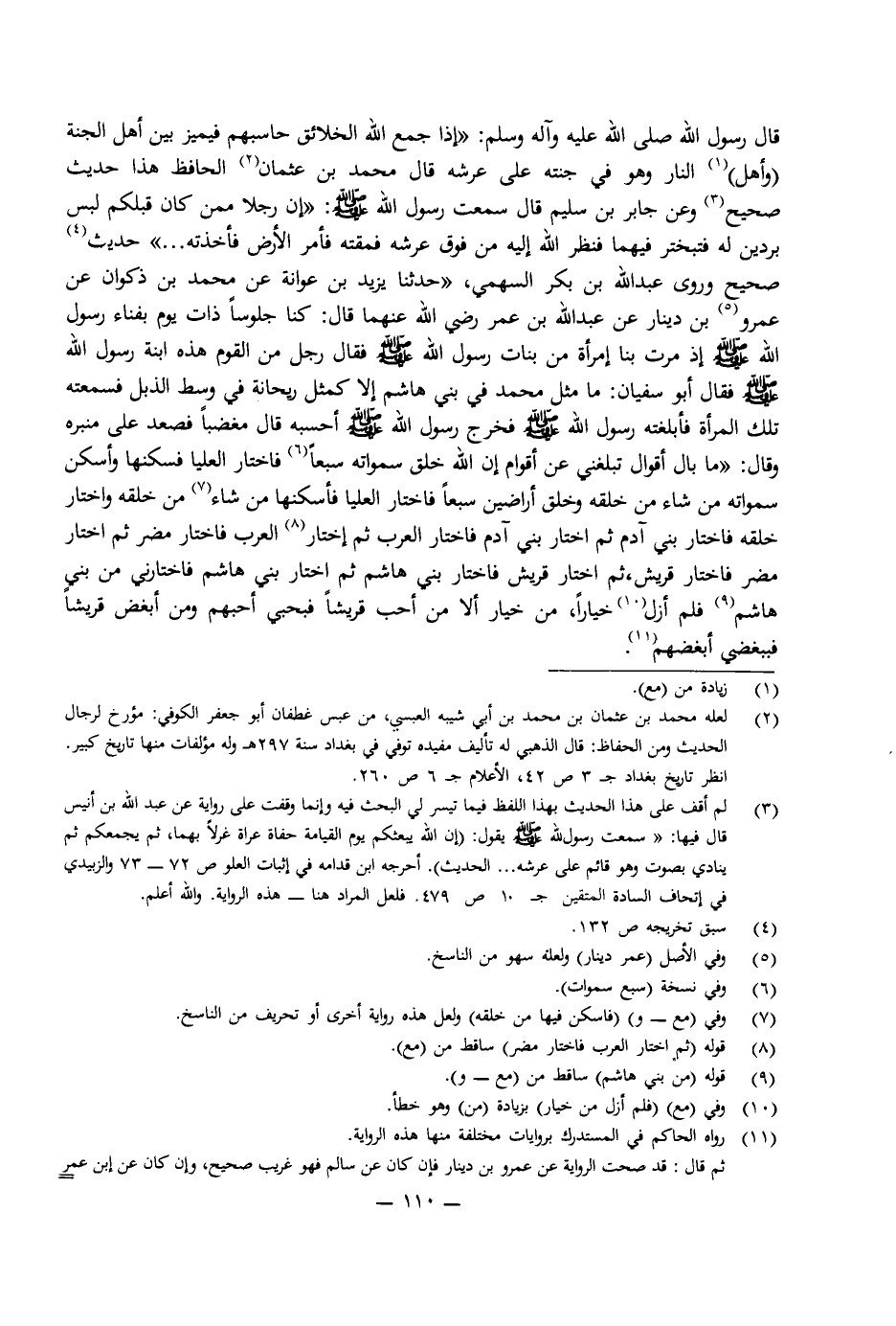 قَالَ رَسُولُ اللَّهِ صَلَّى اللَّهُ عَلَيْهِ وَآلِهِ وَسَلَّمَ: " «إِذَا جَمَعَ اللَّهُ الْخَلَائِقَ حَاسَبَهُمْ فَيَمِيزُ بَيْنَ أَهْلِ الْجَنَّةِ وَأَهْلِ النَّارِ وَهُوَ فِي جَنَّتِهِ عَلَى عَرْشِهِ» ، قَالَ مُحَمَّدُ بْنُ عُثْمَانَ الْحَافِظُ هَذَا حَدِيثٌ صَحِيحٌ وَعَنْ جَابِرِ بْنِ سُلَيْمٍ قَالَ «سَمِعْتُ رَسُولَ اللَّهِ صَلَّى اللَّهُ عَلَيْهِ وَسَلَّمَ يَقُولُ إِنَّ رَجُلًا مِمَّنْ كَانَ قَبْلَكُمْ لَبِسَ بُرْدَيْنِ فَتَبَخْتَرَ فَنَظَرَ اللَّهُ إِلَيْهِ مِنْ فَوْقِ عَرْشِهِ فَمَقَتَهُ فَأَمَرَ الْأَرْضَ فَأَخَذَتْهُ» " حَدِيثٌ صَحِيحٌ وَرَوَى عَبْدُ اللَّهِ بْنُ بَكْرٍ السَّهْمِيُّ، حَدَّثَنَا يَزِيدُ بْنُ عَوَانَةَ عَنْ مُحَمَّدِ بْنِ ذَكْوَانَ عَنْ عَمْرِو بْنِ دِينَارٍ عَنْ عَبْدِ اللَّهِ بْنِ عُمَرَ رَضِيَ اللَّهُ عَنْهُمَا قَالَ: «كُنَّا جُلُوسًا ذَاتَ يَوْمٍ بِفَنَاءِ رَسُولِ اللَّهِ صَلَّى اللَّهُ عَلَيْهِ وَسَلَّمَ إِذْ مَرَّتْ بِنَا امْرَأَةٌ مِنْ بَنَاتِ رَسُولِ اللَّهِ صَلَّى اللَّهُ عَلَيْهِ وَسَلَّمَ فَقَالَ رَجُلٌ مِنَ الْقَوْمِ هَذِهِ ابْنَةُ رَسُولِ اللَّهِ صَلَّى اللَّهُ عَلَيْهِ وَسَلَّمَ فَقَالَ أَبُو سُفْيَانَ مَا مَثَلُ مُحَمَّدٍ فِي بَنِي هَاشِمٍ إِلَّا كَمَثَلِ رَيْحَانَةٍ فِي وَسَطِ الذَّبْلِ فَسَمِعَتْهُ تِلْكَ الْمَرْأَةُ فَأَبْلَغَتْهُ رَسُولَ اللَّهِ صَلَّى اللَّهُ عَلَيْهِ وَسَلَّمَ فَخَرَجَ رَسُولُ اللَّهِ صَلَّى اللَّهُ عَلَيْهِ وَسَلَّمَ أَحْسَبُهُ قَالَ مُغْضَبًا فَصَعِدَ عَلَى مِنْبَرِهِ وَقَالَ: " مَا بَالُ أَقْوَالٍ تَبْلُغُنِي عَنْ أَقْوَامٍ أَنَّ اللَّهَ خَلَقَ سَمَاوَاتِهِ سَبْعًا فَاخْتَارَ الْعُلْيَا فَسَكَنَهَا وَأَسْكَنَ سَمَاوَاتِهِ مَنْ شَاءَ مِنْ خَلْقِهِ وَخَلَقَ أَرَضِينَ سَبْعًا فَاخْتَارَ الْعُلْيَا فَأَسْكَنَ فِيهَا مِنْ خَلْقِهِ وَاخْتَارَ خَلْقَهُ فَاخْتَارَ بَنِي آدَمَ ثُمَّ اخْتَارَ بَنِي آدَمَ فَاخْتَارَ الْعَرَبَ ثُمَّ اخْتَارَ مُضَرَ فَاخْتَارَ قُرَيْشًا، ثُمَّ اخْتَارَ قُرَيْشًا فَاخْتَارَ بَنِي هَاشِمٍ ثُمَّ اخْتَارَ بَنِي هَاشِمٍ فَاخْتَارَنِي مِنْ بَنِي هَاشِمٍ فَلَمْ أَزَلْ خِيَارًا، أَلَا مَنْ أَحَبَّ قُرَيْشًا فَبِحُبِّي أَحَبَّهُمْ وَمَنْ أَبْغَضَ قُرَيْشًا فَبِبُغْضِي أَبْغَضَهُمْ»