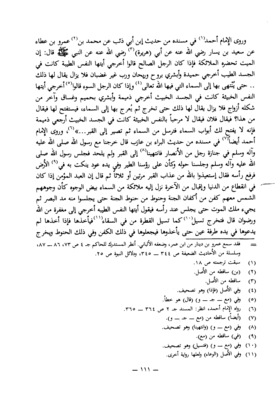 وَرَوَى الْإِمَامُ أَحْمَدُ فِي مُسْنَدِهِ مِنْ حَدِيثِ ابْنِ أَبِي ذِئْبٍ عَنْ مُحَمَّدِ بْنِ عَمْرِو عَنْ عَطَاءٍ عَنْ سَعِيدِ بْنِ يَسَارٍ رَضِيَ اللَّهُ عَنْهُ عَنْ أَبِي (هُرَيْرَةَ) رَضِيَ اللَّهُ عَنْهُ عَنِ النَّبِيِّ صَلَّى اللَّهُ عَلَيْهِ وَسَلَّمَ قَالَ: «إِنَّ الْمَيِّتَ تَحْضُرُهُ الْمَلَائِكَةُ فَإِذَا كَانَ الرَّجُلُ الصَّالِحُ قَالُوا: اخْرُجِي أَيَّتُهَا النَّفْسُ الطَّيِّبَةُ كَانَتْ فِي الْجَسَدِ الطَّيِّبِ اخْرُجِي حَمِيدَةً وَأَبْشِرِي بِرَوْحٍ وَرَيْحَانٍ وَرَبٍّ غَيْرِ غَضْبَانَ فَلَا يَزَالُ يُقَالُ لَهَا ذَلِكَ حَتَّى يَنْتَهِيَ بِهَا إِلَى السَّمَاءِ الَّتِي فِيهَا اللَّهُ تَعَالَى وَإِذَا كَانَ الرَّجُلُ السُّوءُ قَالُوا: اخْرُجِي أَيَّتُهَا النَّفْسُ الْخَبِيثَةُ كَانَتْ فِي الْجَسَدِ الْخَبِيثِ اخْرُجِي ذَمِيمَةً وَأَبْشِرِي بِحَمِيمٍ وَغَسَّاقٍ وَآخَرَ مِنْ شَكْلِهِ أَزْوَاجٌ فَلَا يَزَالُ يُقَالُ لَهَا ذَلِكَ حَتَّى تَخْرُجَ ثُمَّ يُعْرَجُ بِهَا إِلَى السَّمَاءِ، فَيُسْتَفْتَحُ لَهَا فَيُقَالُ مَنْ هَذَا؟ فَيُقَالُ فُلَانٌ فَيُقَالُ: لَا مَرْحَبًا بِالنَّفْسِ الْخَبِيثَةِ كَانَتْ فِي الْجَسَدِ الْخَبِيثِ ارْجِعِي ذَمِيمَةً فَإِنَّهُ لَا يُفْتَحُ لَكِ أَبْوَابُ السَّمَاءِ فَتُرْسَلُ مِنَ السَّمَاءِ ثُمَّ تَصِيرُ إِلَى الْقَبْرِ. . .» وَرَوَى الْإِمَامُ أَحْمَدُ أَيْضًا فِي مُسْنَدِهِ مِنْ حَدِيثِ الْبَرَاءِ بْنِ عَازِبٍ قَالَ «خَرَجْنَا مَعَ رَسُولِ اللَّهِ صَلَّى اللَّهُ عَلَيْهِ وَآلِهِ وَسَلَّمَ فِي جِنَازَةِ رَجُلٍ مِنَ الْأَنْصَارِ فَانْتَهَيْنَا إِلَى الْقَبْرِ وَلَمْ يُلْحَدْ فَجَلَسَ رَسُولُ اللَّهِ صَلَّى اللَّهُ عَلَيْهِ وَآلِهِ وَسَلَّمَ وَجَلَسْنَا حَوْلَهُ كَأَنَّ عَلَى رُءُوسِنَا الطَّيْرَ وَفِي يَدِهِ عُودٌ يَنْكُتُ بِهِ فِي الْأَرْضِ فَرَفَعَ رَأْسَهُ فَقَالَ اسْتَعِيذُوا بِاللَّهِ مِنْ عَذَابِ الْقَبْرِ مَرَّتَيْنِ أَوْ ثَلَاثًا ثُمَّ قَالَ إِنَّ الْعَبْدَ الْمُؤْمِنَ إِذَا كَانَ فِي انْقِطَاعٍ مِنَ الدُّنْيَا وَإِقْبَالٍ مِنَ الْآخِرَةِ نَزَلَ إِلَيْهِ مَلَائِكَةٌ مِنَ السَّمَاءِ بِيضُ الْوُجُوهِ كَأَنَّ وُجُوهَهُمُ الشَّمْسُ مَعَهُمْ كَفَنٌ مِنْ أَكْفَانِ الْجَنَّةِ وَحَنُوطٌ مِنْ حَنُوطِ الْجَنَّةِ حَتَّى يَجْلِسُوا مِنْهُ مَدَّ الْبَصَرِ ثُمَّ يَجِيءُ مَلَكُ الْمَوْتِ حَتَّى يَجْلِسَ عِنْدَ رَأْسِهِ فَيَقُولُ: أَيَّتُهَا النَّفْسُ الطَّيِّبَةُ اخْرُجِي إِلَى مَغْفِرَةٍ مِنَ اللَّهِ وَرِضْوَانٍ قَالَ: فَتَخْرُجُ فَتَسِيلُ كَمَا تَسِيلُ الْقَطْرَةُ مِنْ فِيِّ السِّقَاءِ فَيَأْخُذُهَا فَإِذَا أَخَذَهَا لَمْ يَدْعُوهَا فِي يَدِهِ طَرْفَةَ عَيْنٍ حَتَّى يَأْخُذُوهَا فَيَجْعَلُوهَا فِي ذَلِكَ الْكَفَنِ وَفِي ذَلِكَ الْحَنُوطِ وَيَخْرُجُ