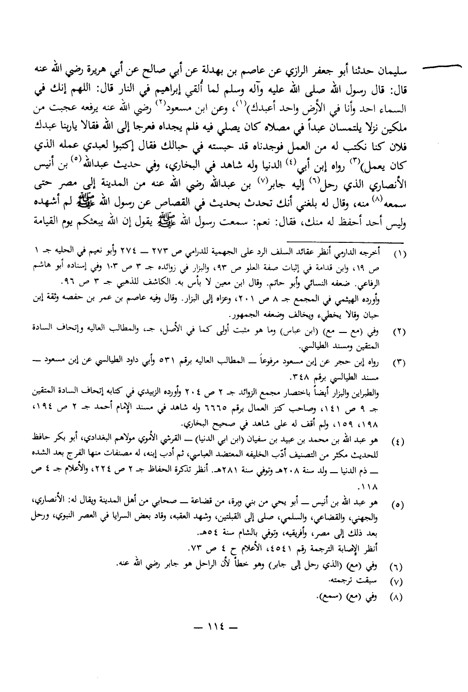 سُلَيْمَانَ حَدَّثَنَا أَبُو جَعْفَرٍ الرَّازِيُّ عَنْ عَاصِمِ ابْنِ بَهْدَلَةَ عَنْ أَبِي صَالِحٍ عَنْ أَبِي هُرَيْرَةَ رَضِيَ اللَّهُ عَنْهُ قَالَ: قَالَ رَسُولُ اللَّهِ صَلَّى اللَّهُ عَلَيْهِ وَآلِهِ وَسَلَّمَ «لَمَّا أُلْقِيَ إِبْرَاهِيمُ فِي النَّارِ قَالَ: اللَّهُمَّ إِنَّكَ فِي السَّمَاءِ أَحَدٌ وَأَنَا فِي الْأَرْضِ وَاحِدٌ أَعْبُدُكَ» ، وَعَنِ ابْنِ عَبَّاسٍ رَضِيَ اللَّهُ عَنْهُمَا يَرْفَعُهُ «عَجِبْتُ مِنْ مَلَكَيْنِ نَزَلَا يَلْتَمِسَانِ عَبْدًا فِي مُصَلَّاهُ كَانَ يُصَلِّي فِيهِ فَلَمْ يَجِدَاهُ فَعَرَجَا إِلَى اللَّهِ فَقَالَا: يَا رَبَّنَا عَبْدُكَ فُلَانٌ كُنَّا نَكْتُبُ لَهُ مِنَ الْعَمَلِ فَوَجَدْنَاهُ قَدْ حَبَسْتَهُ فِي حِبَالِكَ فَقَالَ: اكْتُبُوا لِعَبْدِي عَمَلَهُ الَّذِي كَانَ يَعْمَلُ» رَوَاهُ ابْنُ أَبِي الدُّنْيَا وَلَهُ شَاهِدٌ فِي الْبُخَارِيِّ، وَفِي حَدِيثِ عَبْدِ اللَّهِ بْنِ أَنِيسٍ الْأَنْصَارِيِّ الَّذِي رَحَلَ إِلَى جَابِرِ بْنِ عَبْدِ اللَّهِ رَضِيَ اللَّهُ عَنْهُ مِنَ الْمَدِينَةِ إِلَى مِصْرَ حَتَّى سَمِعَهُ مِنْهُ، وَقَالَ لَهُ: بَلَغَنِي أَنَّكَ تُحَدِّثُ بِحَدِيثٍ فِي الْقَصَاصِ عَنْ رَسُولِ اللَّهِ صَلَّى اللَّهُ عَلَيْهِ وَسَلَّمَ لَمْ أَشْهَدْهُ وَلَيْسَ أَحَدٌ أَحْفَظُ لَهُ مِنْكَ، فَقَالَ: نَعَمْ «سَمِعْتُ رَسُولَ اللَّهِ صَلَّى اللَّهُ عَلَيْهِ وَسَلَّمَ يَقُولُ: إِنَّ اللَّهَ يَبْعَثُكُمْ يَوْمَ الْقِيَامَةِ