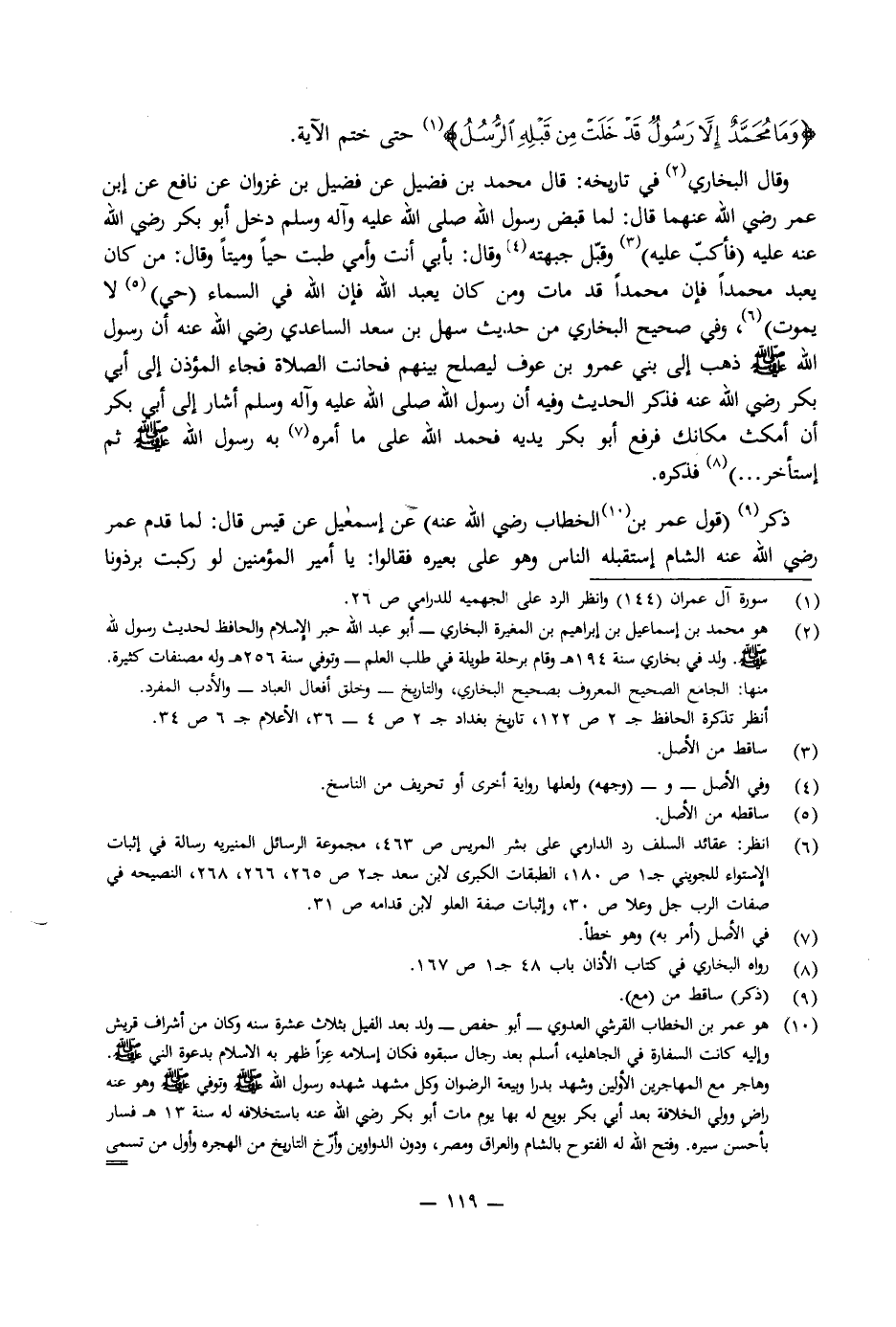 وَقَالَ الْبُخَارِيُّ فِي تَارِيخِهِ: قَالَ مُحَمَّدُ بْنُ فُضَيْلٍ عَنْ فُضَيْلِ بْنِ غَزْوَانَ عَنْ نَافِعٍ عَنِ ابْنِ عُمَرَ رَضِيَ اللَّهُ عَنْهُمَا قَالَ: لَمَّا قُبِضَ رَسُولُ اللَّهِ صَلَّى اللَّهُ عَلَيْهِ وَآلِهِ وَسَلَّمَ دَخَلَ أَبُو بَكْرٍ رَضِيَ اللَّهُ عَنْهُ عَلَيْهِ (فَأَكَبَّ عَلَيْهِ) وَقَبَّلَ جَبْهَتَهُ وَقَالَ: بِأَبِي أَنْتَ وَأُمِّي طِبْتَ حَيًّا وَمَيِّتًا، وَقَالَ: مَنْ كَانَ يَعْبُدُ مُحَمَّدًا فَإِنَّ مُحَمَّدًا قَدْ مَاتَ وَمَنْ كَانَ يَعْبُدُ اللَّهَ فَإِنَّ اللَّهَ فِي السَّمَاءِ (حَيٌّ) لَا يَمُوتُ، وَفِي صَحِيحِ الْبُخَارِيِّ مِنْ حَدِيثِ سَهْلِ بْنِ سَعْدٍ السَّاعِدِيِّ رَضِيَ اللَّهُ عَنْهُ «أَنَّ رَسُولَ اللَّهِ صَلَّى اللَّهُ عَلَيْهِ وَسَلَّمَ ذَهَبَ إِلَى بَنِي عَمْرِو بْنِ عَوْفٍ لِيُصْلِحَ بَيْنَهُمْ فَحَانَتِ الصَّلَاةُ فَجَاءَ الْمُؤَذِّنُ إِلَى أَبِي بَكْرٍ رَضِيَ اللَّهُ عَنْهُ فَذَكَرَ الْحَدِيثَ وَفِيهِ أَنَّ رَسُولَ اللَّهِ صَلَّى اللَّهُ عَلَيْهِ وَآلِهِ وَسَلَّمَ أَشَارَ إِلَى أَبِي بَكْرٍ أَنِ امْكُثْ مَكَانَكَ فَرَفَعَ أَبُو بَكْرٍ يَدَيْهِ فَحَمِدَ اللَّهَ عَلَى مَا أَمَرَهُ بِهِ رَسُولُ اللَّهِ صَلَّى اللَّهُ عَلَيْهِ وَسَلَّمَ ثُمَّ اسْتَأْخَرَ. . . فَذَكَرَهُ.