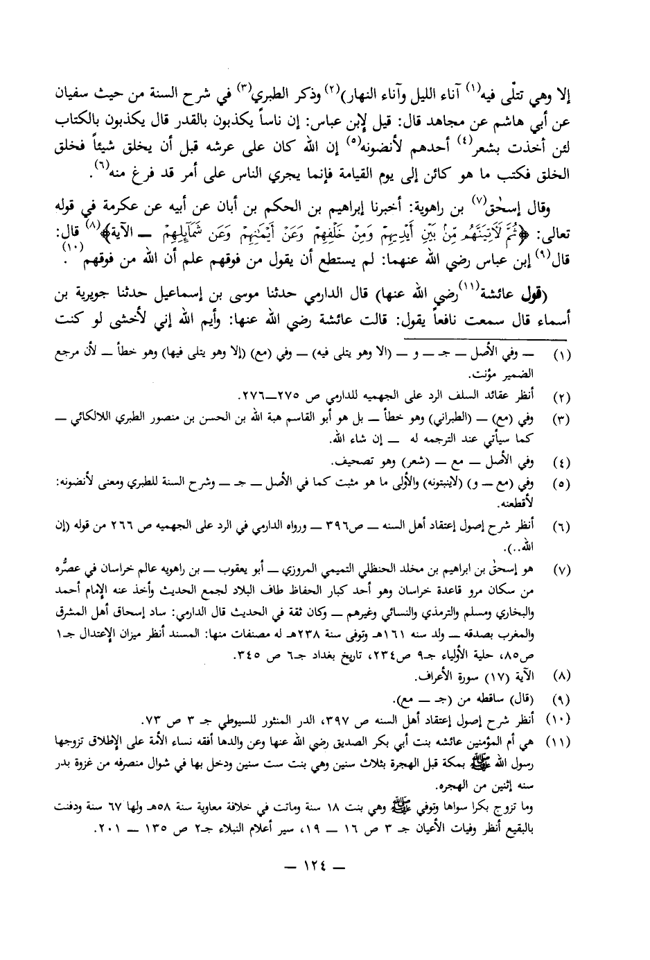 إِلَّا وَهِيَ تُتْلَى فِيهَا آنَاءَ اللَّيْلِ وَآنَاءَ النَّهَارِ. وَذَكَرَ الطَّبَرَانِيُّ فِي شَرْحِ السُّنَّةِ مِنْ حَدِيثِ سُفْيَانَ عَنْ أَبِي هَاشِمٍ عَنْ مُجَاهِدٍ قَالَ: قِيلَ لِابْنِ عَبَّاسٍ: إِنَّ نَاسًا يُكَذِّبُونَ بِالْقَدَرِ، قَالَ: يُكَذِّبُونَ بِالْكِتَابِ لَئِنْ أَخَذْتُ شَعْرَ أَحَدِهِمْ لَأَنْضُوَنَّهُ إِنِ اللَّهَ كَانَ عَلَى عَرْشِهِ قَبْلَ أَنْ يَخْلُقَ شَيْئًا فَخَلَقَ الْخَلْقَ فَكَتَبَ مَا هُوَ كَائِنٌ إِلَى يَوْمِ الْقِيَامَةِ، فَإِنَّمَا يَجْرِي النَّاسُ عَلَى أَمْرٍ قَدْ فُرِغَ مِنْهُ.