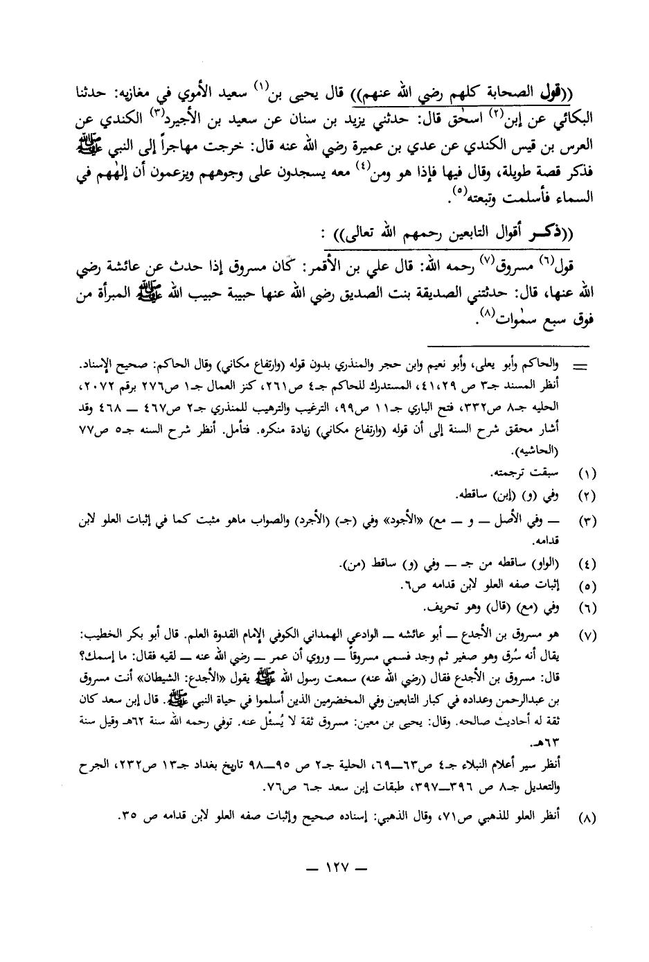 قَوْلُ مَسْرُوقٌ رَحِمَهُ اللَّهُ: قَالَ عَلِيُّ بْنُ الْأَقْمَرِ: كَانَ مَسْرُوقٌ إِذَا حَدَّثَ عَنْ عَائِشَةَ رَضِيَ اللَّهُ عَنْهَا، قَالَ: حَدَّثَتْنِي الصِّدِّيقَةُ بِنْتُ الصِّدِّيقِ رَضِيَ اللَّهُ عَنْهُمَا حَبِيبَةُ حَبِيبِ اللَّهِ صَلَّى اللَّهُ عَلَيْهِ وَسَلَّمَ الْمُبَرَّأَةُ مِنْ فَوْقِ سَبْعِ سَمَاوَاتٍ.