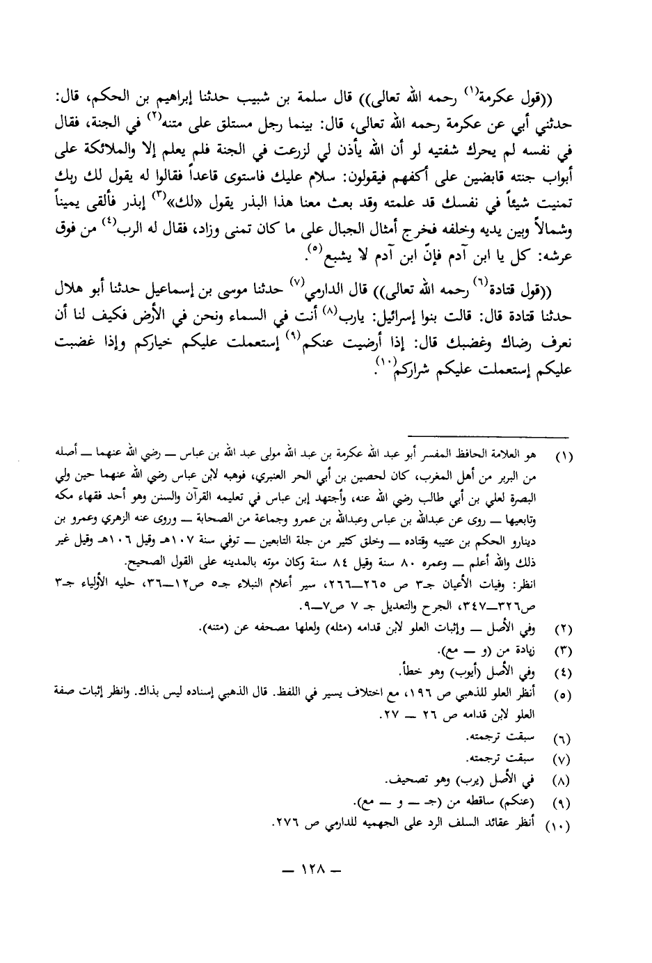 " قَوْلُ عِكْرِمَةَ رَحِمَهُ اللَّهُ تَعَالَى " قَالَ سَلَمَةُ بْنُ شَبِيبٍ حَدَّثَنَا إِبْرَاهِيمُ بْنُ الْحَكَمِ قَالَ حَدَّثَنِي أَبِي عَنْ عِكْرِمَةَ رَحِمَهُ اللَّهُ تَعَالَى، قَالَ: بَيْنَمَا رَجُلٌ مُسْتَلْقٍ عَلَى مَتْنِهِ فِي الْجَنَّةِ، فَقَالَ فِي نَفْسِهِ لَمْ يُحَرِّكْ شَفَتَيْهِ: لَوْ أَنَّ اللَّهَ يَأْذَنُ لِي لَزَرَعْتُ فِي الْجَنَّةِ فَلَمْ يَعْلَمْ إِلَّا وَالْمَلَائِكَةُ عَلَى أَبْوَابِ جَنَّتِهِ قَابِضِينَ عَلَى أَكُفِّهِمْ فَيَقُولُونَ: سَلَامٌ عَلَيْكَ فَاسْتَوَى قَاعِدًا، فَقَالُوا لَهُ: يَقُولُ لَكَ رَبُّكَ تَمَنَّيْتَ شَيْئًا فِي نَفْسِكَ قَدْ عَلِمْتُهُ وَقَدْ بَعَثَ مَعَنَا هَذَا الْبَذْرَ، يَقُولُ لَكَ: ابْذُرْ فَأَلْقَى يَمِينًا وَشِمَالًا وَبَيْنَ يَدَيْهِ وَخَلْفَهُ فَخَرَجَ أَمْثَالَ الْجِبَالِ عَلَى مَا كَانَ تَمَنَّى وَزَادَ، فَقَالَ لَهُ الرَّبُّ مِنْ فَوْقِ عَرْشِهِ: كُلْ يَا ابْنَ آدَمَ فَإِنَّ ابْنَ آدَمَ لَا يَشْبَعُ.
