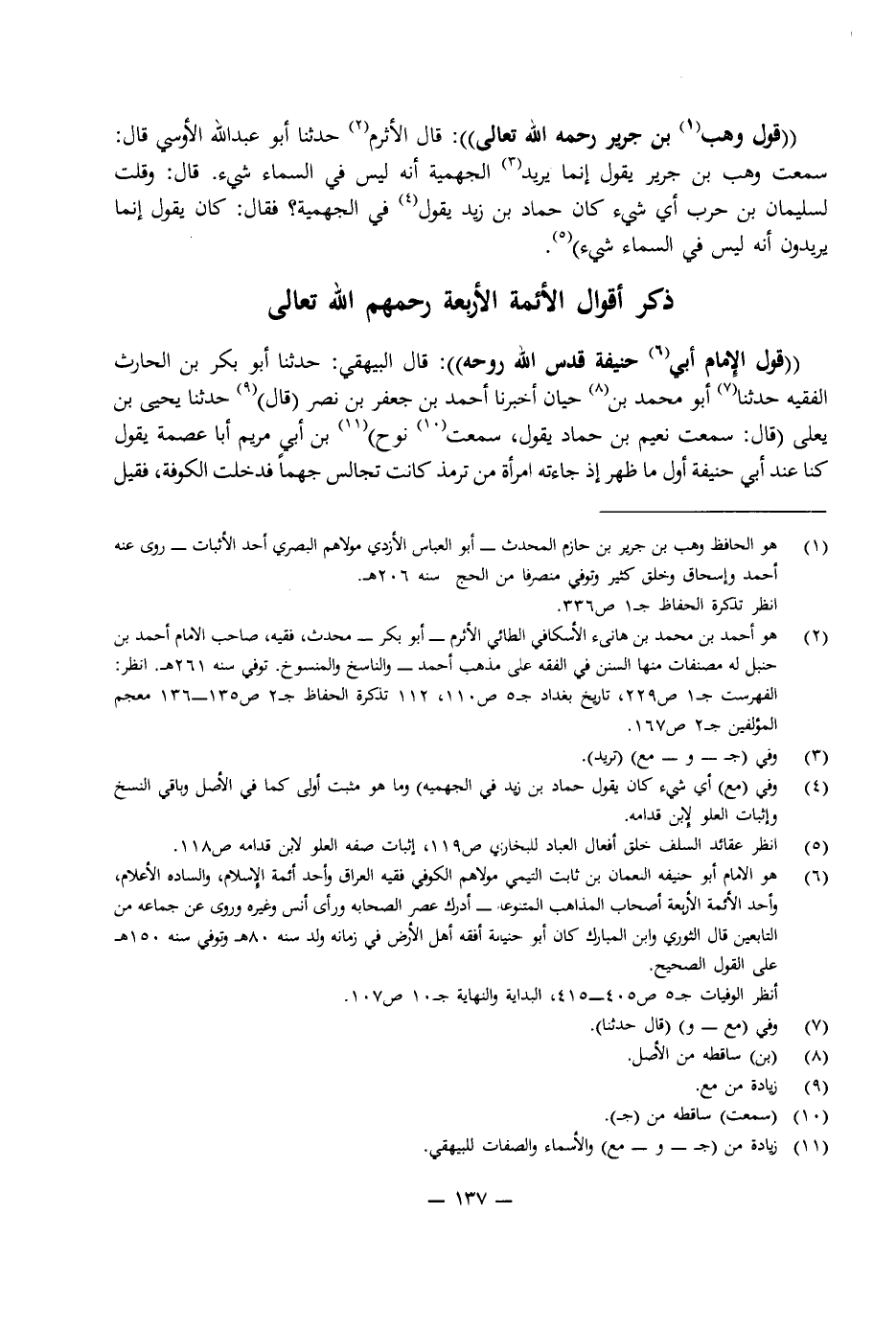 " قَوْلُ وَهْبِ بْنِ جَرِيرٍ رَحِمَهُ اللَّهُ تَعَالَى ": قَالَ الْأَثْرَمُ حَدَّثَنَا أَبُو عَبْدِ اللَّهِ الْأَوْسِيُّ قَالَ: سَمِعْتُ وَهْبَ بْنَ جَرِيرٍ يَقُولُ: إِنَّمَا يُرِيدُ الْجَهْمِيَّةُ أَنَّهُ لَيْسَ فِي السَّمَاءِ شَيْءٌ. قَالَ: وَقُلْتُ لِسُلَيْمَانَ بْنِ حَرْبٍ أَيَّ شَيْءٍ كَانَ حَمَّادُ بْنُ زَيْدٍ يَقُولُ فِي الْجَهْمِيَّةِ؟ فَقَالَ: كَانَ يَقُولُ إِنَّمَا يُرِيدُونَ أَنَّهُ لَيْسَ فِي السَّمَاءِ شَيْءٌ.