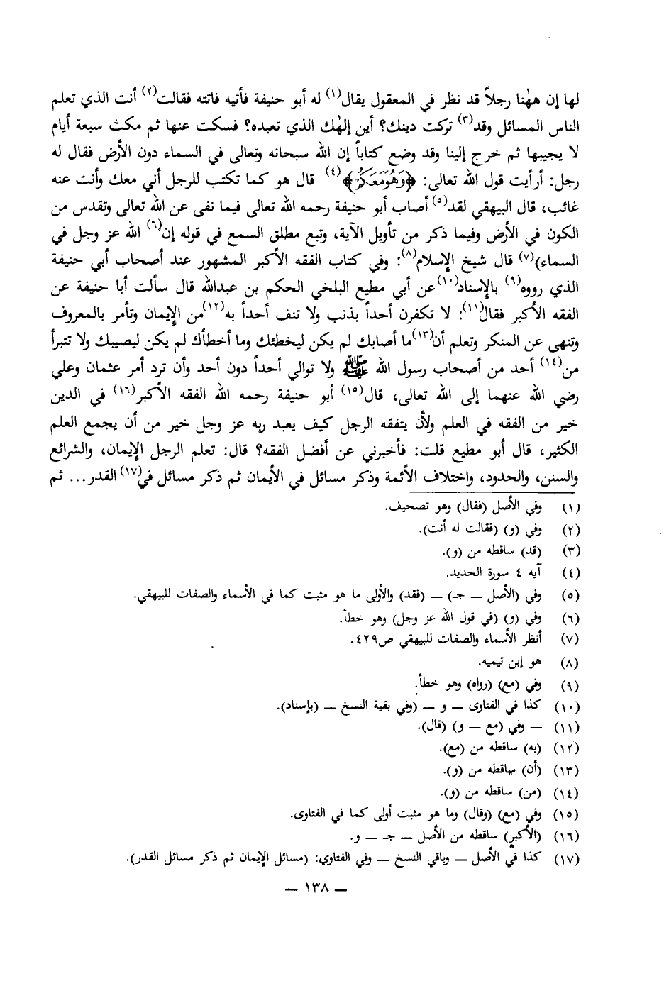 لَهَا إِنَّ هَاهُنَا رَجُلًا قَدْ نَظَرَ فِي الْمَعْقُولِ يُقَالُ لَهُ: أَبُو حَنِيفَةَ، فَأْتِيهِ فَأَتَتْهُ فَقَالَتْ: أَنْتَ الَّذِي تُعَلِّمَ النَّاسَ الْمَسَائِلَ وَقَدْ تَرَكْتَ دِينَكَ؟ أَيْنَ إِلَهُكَ الَّذِي تَعْبُدُهُ؟ فَسَكَتَ عَنْهَا ثُمَّ مَكَثَ سَبْعَةَ أَيَّامٍ لَا يُجِيبُهَا ثُمَّ خَرَجَ إِلَيْنَا وَقَدْ وَضَعَ كِتَابًا إِنَّ اللَّهَ سُبْحَانَهُ وَتَعَالَى فِي السَّمَاءِ دُونَ الْأَرْضِ فَقَالَ لَهُ رَجُلٌ: أَرَأَيْتَ قَوْلَ اللَّهِ تَعَالَى: {وَهُوَ مَعَكُمْ} [الحديد: 4] قَالَ هُوَ كَمَا تَكْتُبُ لِلرَّجُلِ إِنِّي مَعَكَ وَأَنْتَ عَنْهُ غَائِبٌ، قَالَ الْبَيْهَقِيُّ: لَقَدْ أَصَابَ أَبُو حَنِيفَةَ رَحِمَهُ اللَّهُ تَعَالَى فِيمَا نَفَى عَنِ اللَّهِ تَعَالَى وَتَقَدَّسَ مِنَ الْكَوْنِ فِي الْأَرْضِ وَفِيمَا ذَكَرَ مِنْ تَأْوِيلِ الْآيَةِ، وَتَبِعَ مُطْلَقَ السَّمْعِ فِي قَوْلِهِ إِنَّ اللَّهَ عَزَّ وَجَلَّ فِي السَّمَاءِ قَالَ شَيْخُ الْإِسْلَامِ: وَفِي كِتَابِ الْفِقْهِ الْأَكْبَرِ الْمَشْهُورِ عِنْدَ أَصْحَابِ أَبِي حَنِيفَةَ الَّذِي رَوَوْهُ بِالْإِسْنَادِ عَنْ أَبِي مُطِيعٍ الْبَلْخِيِّ الْحَكَمِ بْنِ عَبْدِ اللَّهِ قَالَ: سَأَلْتُ أَبَا حَنِيفَةَ عَنِ الْفِقْهِ الْأَكْبَرِ قَالَ: لَا تُكَفِّرْ أَحَدًا بِذَنْبٍ وَلَا تَنْفِ أَحَدًا مِنَ الْإِيمَانِ وَتَأْمُرُ بِالْمَعْرُوفِ وَتَنْهَى عَنِ الْمُنْكَرِ وَتَعْلَمُ أَنَّ مَا أَصَابَكَ لَمْ يَكُنْ لِيُخْطِئَكَ وَمَا أَخْطَأَكَ لَمْ يَكُنْ لِيُصِيبَكَ وَلَا تَتَبَرَّأْ مِنْ أَحَدٍ مِنْ أَصْحَابِ رَسُولِ اللَّهِ صَلَّى اللَّهُ عَلَيْهِ وَسَلَّمَ وَلَا تُوَالِي أَحَدًا دُونَ أَحَدٍ وَأَنْ تَرُدَّ أَمْرَ عُثْمَانَ وَعَلِيٍّ رَضِيَ اللَّهُ عَنْهُمَا إِلَى اللَّهِ تَعَالَى، قَالَ أَبُو حَنِيفَةَ رَحِمَهُ اللَّهُ الْفِقْهُ الْأَكْبَرُ فِي الدِّينِ خَيْرٌ مِنَ الْفِقْهِ فِي الْعِلْمِ، وَلَأَنْ يَتَفَقَّهَ الرَّجُلُ كَيْفَ يَعْبُدُ رَبَّهُ عَزَّ وَجَلَّ خَيْرٌ مِنْ أَنْ يَجْمَعَ الْعِلْمَ الْكَثِيرَ قَالَ أَبُو مُطِيعٍ قُلْتُ: فَأَخْبِرْنِي عَنْ أَفْضَلِ الْفِقْهِ؟ قَالَ: يَتَعَلَّمُ الرَّجُلُ الْإِيمَانَ وَالشَّرَائِعَ، وَالسُّنَنَ، وَالْحُدُودَ، وَاخْتِلَافَ الْأَئِمَّةِ. وَذَكَرَ مَسَائِلَ فِي الْإِيمَانِ ثُمَّ ذَكَرَ مَسَائِلَ فِي الْقَدَرِ. . . ثُمَّ