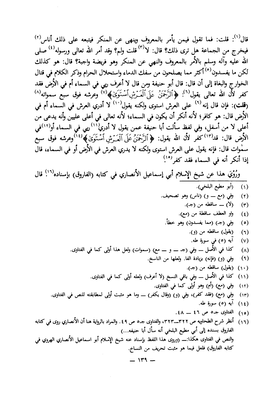 قَالَ: فَقُلْتُ: فَمَا تَقُولُ فِيمَنْ يَأْمُرُ بِالْمَعْرُوفِ وَيَنْهَى عَنِ الْمُنْكَرِ فَيَتْبَعُهُ عَلَى ذَلِكَ أُنَاسٌ فَيَخْرُجُ مِنَ الْجَمَاعَةِ، هَلْ تَرَى ذَلِكَ؟ قَالَ: لَا، قُلْتُ: وَلِمَ؟ وَقَدْ أَمَرَ اللَّهُ تَعَالَى رَسُولَهُ صَلَّى اللَّهُ عَلَيْهِ وَآلِهِ وَسِلْمَ بِالْأَمْرِ بِالْمَعْرُوفِ وَالنَّهْيِ عَنِ الْمُنْكَرِ وَهُوَ فَرِيضَةٌ وَاجِبَةٌ. فَقَالَ: هُوَ كَذَلِكَ لَكِنْ مَا يُفْسِدُونَ أَكْثَرَ مِمَّا يُصْلِحُونَ مِنْ سَفْكِ الدِّمَاءِ وَاسْتِحْلَالِ الْحَرَامِ وَذَكَرَ الْكَلَامَ فِي قِتَالِ الْخَوَارِجِ وَالْبُغَاةِ إِلَى أَنْ قَالَ: قَالَ أَبُو حَنِيفَةَ وَمَنْ قَالَ: لَا أَعْرِفُ رَبِّي فِي السَّمَاءِ أَمْ فِي الْأَرْضِ فَقَدْ كَفَرَ لِأَنَّ اللَّهَ تَعَالَى يَقُولُ: {الرَّحْمَنُ عَلَى الْعَرْشِ اسْتَوَى} [طه: 5] وَعَرْشُهُ فَوْقَ سَبْعِ سَمَاوَاتٍ (قُلْتُ) : فَإِنْ قَالَ: إِنَّهُ عَلَى الْعَرْشِ وَلَكِنَّهُ يَقُولُ: لَا أَدْرِي الْعَرْشَ فِي السَّمَاءِ أَمْ فِي الْأَرْضِ قَالَ: هُوَ كَافِرٌ ; لِأَنَّهُ أَنْكَرَ أَنْ يَكُونَ فِي السَّمَاءِ ; لِأَنَّهُ تَعَالَى فِي أَعْلَى عِلِّيِّينَ وَأَنَّهُ يُدْعَى مِنْ أَعْلَى لَا مِنْ أَسْفَلَ، وَفِي لَفْظٍ سَأَلْتُ أَبَا حَنِيفَةَ عَمَّنْ يَقُولُ: لَا أَدْرِي رَبِّي فِي السَّمَاءِ أَمْ فِي الْأَرْضِ قَالَ: قَدْ كَفَرَ لِأَنَّ اللَّهَ يَقُولُ: {الرَّحْمَنُ عَلَى الْعَرْشِ اسْتَوَى} [طه: 5] وَعَرْشُهُ فَوْقَ سَبْعِ سَمَاوَاتٍ قَالَ: فَإِنَّهُ يَقُولُ: عَلَى الْعَرْشِ اسْتَوَى وَلَكِنَّهُ لَا يَدْرِي الْعَرْشَ فِي الْأَرْضِ أَوْ فِي السَّمَاءِ، قَالَ إِذَا أَنْكَرَ أَنَّهُ فِي السَّمَاءِ فَقَدْ كَفَرَ.
