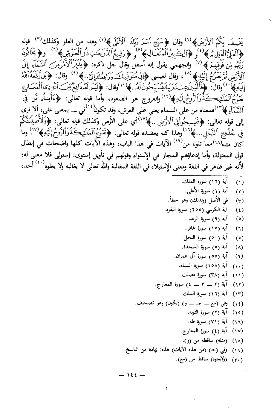 وَقَالَ: {سَبِّحِ اسْمَ رَبِّكَ الْأَعْلَى} [الأعلى: 1] وَهَذَا مِنَ الْعُلُوِّ وَكَذَلِكَ قَوْلُهُ: {الْعَلِيُّ الْعَظِيمُ} [البقرة: 255] وَ {الْكَبِيرُ الْمُتَعَالِ} [الرعد: 9] وَ {رَفِيعُ الدَّرَجَاتِ ذُو الْعَرْشِ} [غافر: 15] وَ {يَخَافُونَ رَبَّهُمْ مِنْ فَوْقِهِمْ} [النحل: 50] وَالْجَهْمِيُّ يَقُولُ إِنَّهُ أَسْفَلُ وَقَالَ جَلَّ ذِكْرُهُ {يُدَبِّرُ الْأَمْرَ مِنَ السَّمَاءِ إِلَى الْأَرْضِ ثُمَّ يَعْرُجُ إِلَيْهِ} [السجدة: 5] وَقَالَ لِعِيسَى: {إِنِّي مُتَوَفِّيكَ وَرَافِعُكَ إِلَيَّ} [آل عمران: 55] وَقَالَ: {بَلْ رَفَعَهُ اللَّهُ إِلَيْهِ} [النساء: 158] وَقَالَ {فَالَّذِينَ عِنْدَ رَبِّكَ يُسَبِّحُونَ لَهُ} [فصلت: 38] وَقَالَ: {لَيْسَ لَهُ دَافِعٌ مِنَ اللَّهِ ذِي الْمَعَارِجِ تَعْرُجُ الْمَلَائِكَةُ وَالرُّوحُ إِلَيْهِ} [المعارج: 2] وَالْعُرُوجُ هُوَ الصُّعُودُ وَأَمَّا قَوْلُهُ تَعَالَى: {أَأَمِنْتُمْ مَنْ فِي السَّمَاءِ} [الملك: 16] فَمَعْنَاهُ مَنْ عَلَى السَّمَاءِ يَعْنِي عَلَى الْعَرْشِ، وَقَدْ تَكُونُ فِي بِمَعْنَى عَلَى أَلَا تَرَى إِلَى قَوْلِهِ تَعَالَى: {فَسِيحُوا فِي الْأَرْضِ} [التوبة: 2] أَيْ: عَلَى الْأَرْضِ وَكَذَلِكَ قَوْلُهُ تَعَالَى: {وَلَأُصَلِّبَنَّكُمْ فِي جُذُوعِ النَّخْلِ} [طه: 71] وَهَذَا كُلُّهُ يُعَضِّدُهُ قَوْلُهُ تَعَالَى: {تَعْرُجُ الْمَلَائِكَةُ وَالرُّوحُ إِلَيْهِ} [المعارج: 4] . وَمَا كَانَ مِثْلَهُ مِمَّا تَلَوْنَا مِنَ الْآيَاتِ فِي هَذَا الْبَابِ، وَهَذِهِ الْآيَاتُ كُلُّهَا وَاضِحَاتٌ فِي إِبْطَالِ قَوْلِ الْمُعْتَزِلَةِ، وَأَمَّا ادِّعَاؤُهُمُ الْمَجَازَ فِي الِاسْتِوَاءِ وَقَوْلُهُمْ فِي تَأْوِيلِ اسْتَوَى: اسْتَوْلَى فَلَا مَعْنَى لَهُ ; لِأَنَّهُ غَيْرُ ظَاهِرٍ فِي اللُّغَةِ وَمَعْنَى الِاسْتِيلَاءِ فِي اللُّغَةِ الْمُغَالَبَةُ وَاللَّهُ تَعَالَى لَا يُغَالِبُهُ وَلَا يَعْلُوهُ أَحَدٌ،