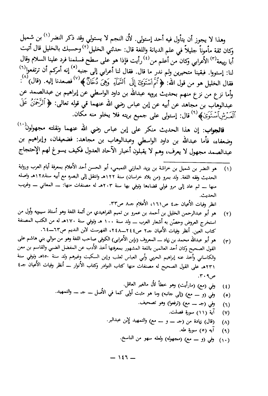 وَهَذَا لَا يَجُوزُ أَنْ يَتَأَوَّلَ فِيهِ أَحَدٌ اسْتَوْلَى. لِأَنَّ النَّجْمَ لَا يَسْتَوْلِي وَقَدْ ذَكَرَ النَّضْرُ بْنُ شُمَيْلٍ وَكَانَ ثِقَةً مَأْمُونًا جَلِيلًا فِي عِلْمِ الدِّيَانَةِ وَاللُّغَةِ قَالَ: حَدَّثَنِي الْخَلِيلُ وَحَسْبُكَ بِالْخَلِيلِ قَالَ: أَتَيْتُ أَبَا رَبِيعَةَ الْأَعْرَابِيَّ وَكَانَ مِنْ أَعْلَمِ مَا رَأَيْتُ فَإِذَا هُوَ عَلَى سَطْحٍ فَسَلَّمْنَا فَرَدَّ عَلَيْنَا السَّلَامَ وَقَالَ لَنَا. . اسْتَوُوا. فَبَقِينَا مُتَحَيِّرِينَ وَلَمْ نَدْرِ مَا قَالَ. فَقَالَ لَنَا أَعْرَابِيٌّ إِلَى جَنْبِهِ إِنَّهُ أَمَرَكُمْ أَنْ تَرْفَعُوا، فَقَالَ الْخَلِيلُ: هُوَ مِنْ قَوْلِ اللَّهِ: {ثُمَّ اسْتَوَى إِلَى السَّمَاءِ وَهِيَ دُخَانٌ} [فصلت: 11] فَصَعِدْنَا إِلَيْهِ. قَالَ: وَأَمَّا نَزْعُ مَنْ نَزَعَ مِنْهُمْ بِحَدِيثٍ يَرْوِيهِ عَبْدُ اللَّهِ بْنُ دَاوُدَ الْوَاسِطِيُّ عَنْ إِبْرَاهِيمَ بْنِ عَبْدِ الصَّمَدِ عَنْ عَبْدِ الْوَهَّابِ بْنِ مُجَاهِدٍ عَنْ أَبِيهِ عَنِ ابْنِ عَبَّاسٍ رَضِيَ اللَّهُ عَنْهُمَا فِي قَوْلِهِ تَعَالَى: {الرَّحْمَنُ عَلَى الْعَرْشِ اسْتَوَى} [طه: 5] قَالَ: اسْتَوْلَى عَلَى جَمِيعِ بَرِّيَّتِهِ فَلَا يَخْلُو مِنْهُ مَكَانٌ.