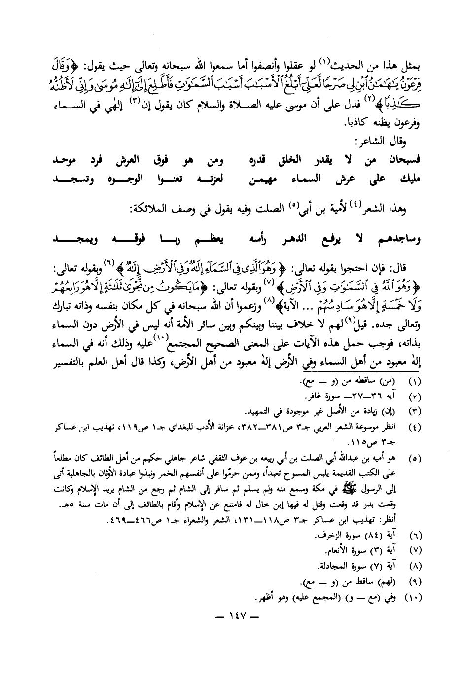بِمِثْلِ هَذَا مِنَ الْحَدِيثِ لَوْ عَقَلُوا وَأَنْصَفُوا، أَمَا سَمِعُوا اللَّهَ سُبْحَانَهُ حَيْثُ يَقُولُ: {وَقَالَ فِرْعَوْنُ يَاهَامَانُ ابْنِ لِي صَرْحًا لَعَلِّي أَبْلُغُ الْأَسْبَابَ أَسْبَابَ السَّمَاوَاتِ فَأَطَّلِعَ إِلَى إِلَهِ مُوسَى وَإِنِّي لَأَظُنُّهُ كَاذِبًا} [غافر: 36] فَدَلَّ عَلَى أَنَّ مُوسَى عَلَيْهِ الصَّلَاةُ وَالسَّلَامُ كَانَ يَقُولُ إِنَّ إِلَهِيَ فِي السَّمَاءِ وَفِرْعَوْنُ يَظُنُّهُ كَاذِبًا.