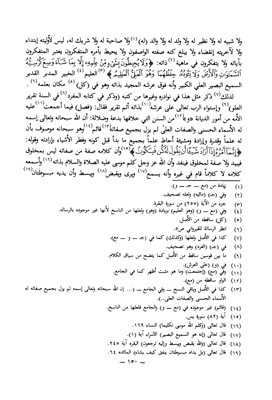 لِذَلِكَ ذَكَرَ مِثْلَ هَذَا فِي نَوَادِرِهِ وَغَيْرِهَا مَنْ كُتُبِهِ (وَذَكَرَ فِي كِتَابِهِ الْمُفْرَدِ فِي السُّنَّةِ تَقْرِيرَ الْعُلُوِّ) وَاسْتِوَاءِ الرَّبِّ تَعَالَى عَلَى عَرْشِهِ بِذَاتِهِ أَتَمَّ تَقْرِيرٍ فَقَالَ: (فَصْلٌ) فِيمَا اجْتَمَعَتْ عَلَيْهِ الْأُمُورُ مِنْ أُمُورِ الدِّيَانَةِ " وَ " مِنَ السُّنَنِ الَّتِي خِلَافُهَا بِدْعَةٌ وَضَلَالَةٌ: أَنَّ اللَّهَ سُبْحَانَهُ وَتَعَالَى اسْمُهُ لَهُ الْأَسْمَاءُ الْحُسْنَى وَالصِّفَاتُ الْعُلَى لَمْ يَزَلْ بِجَمِيعِ صِفَاتِهِ قَائِمٌ وَهُوَ سُبْحَانُهُ مَوْصُوفٌ بِأَنَّ لَهُ عِلْمًا وَقُدْرَةً وَإِرَادَةً وَمَشِيئَةً أَحَاطَ عِلْمًا بِجَمِيعِ مَا بَدَأَ قَبْلَ كَوْنِهِ فَطَرَ الْأَشْيَاءَ بِإِرَادَتِهِ وَقَوْلِهِ: {إِنَّمَا أَمْرُهُ إِذَا أَرَادَ شَيْئًا أَنْ يَقُولَ لَهُ كُنْ فَيَكُونُ} [يس: 82] وَأَنَّ كَلَامَهُ صِفَةٌ مِنْ صِفَاتِهِ لَيْسَ بِمَخْلُوقٍ فَيَبِيدُ، وَلَا صِفَةٍ لِمَخْلُوقٍ فَيَنْفَدُ، وَأَنَّ اللَّهَ عَزَّ وَجَلَّ كَلَّمَ مُوسَى عَلَيْهِ الصَّلَاةُ وَالسَّلَامُ بِذَاتِهِ وَأَسْمَعُهُ كَلَامَهُ لَا كَلَامًا قَامَ فِي غَيْرِهِ، وَأَنَّهُ يَسْمَعُ وَيَرَى وَيَقْبِضُ وَيَبْسُطُ وَأَنَّ يَدَيْهِ مَبْسُوطَتَانِ