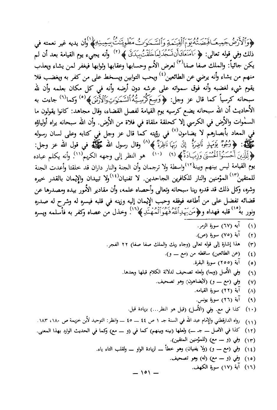{وَالْأَرْضُ جَمِيعًا قَبْضَتُهُ يَوْمَ الْقِيَامَةِ وَالسَّماوَاتُ مَطْوِيَّاتٌ بِيَمِينِهِ} [الزمر: 67] وَأَنَّ يَدَيْهِ غَيْرُ نِعْمَتِهِ فِي ذَلِكَ وَفِي قَوْلِهِ تَعَالَى: {مَا مَنَعَكَ أَنْ تَسْجُدَ لِمَا خَلَقْتُ بِيَدَيَّ} [ص: 75] وَأَنَّهُ يَجِيءُ يَوْمَ الْقِيَامَةِ بَعْدَ أَنْ لَمْ يَكُنْ جَائِيًا: وَالْمَلَكُ صَفًّا صَفًّا لِعَرْضِ الْأُمَمِ وَحِسَابِهَا وَعِقَابِهَا وَثَوَابِهَا فَيَغْفِرُ لِمَنْ يَشَاءُ وَيُعَذِّبُ مَنْ يَشَاءُ وَأَنَّهُ يَرْضَى عَنِ الطَّائِعِينَ وَيُحِبُّ التَّوَّابِينَ وَيَسْخَطُ عَلَى مَنْ كَفَرَ بِهِ وَيَغْضَبُ فَلَا يَقُومُ شَيْءٌ لِغَضَبِهِ وَأَنَّهُ فَوْقَ سَمَاوَاتِهِ عَلَى عَرْشِهِ دُونَ أَرْضِهِ وَأَنَّهُ فِي كُلِّ مَكَانٍ بِعِلْمِهِ وَأَنَّ لِلَّهِ سُبْحَانَهُ كُرْسِيًّا كَمَا قَالَ عَزَّ وَجَلَّ: {وَسِعَ كُرْسِيُّهُ السَّمَاوَاتِ وَالْأَرْضَ} [البقرة: 255] وَكَمَا جَاءَتْ بِهِ الْأَحَادِيثُ أَنَّ اللَّهَ سُبْحَانَهُ يَضَعُ كُرْسِيَّهُ يَوْمَ الْقِيَامَةِ لِفَصْلِ الْقَضَاءِ، وَقَالَ مُجَاهِدٌ: كَانُوا يَقُولُونَ مَا السَّمَاوَاتُ وَالْأَرْضُ فِي الْكُرْسِيِّ إِلَّا كَحَلْقَةٍ مُلْقَاةٍ فِي فَلَاةٍ مِنَ الْأَرْضِ. وَأَنَّ اللَّهَ سُبْحَانَهُ يَرَاهُ أَوْلِيَاؤُهُ فِي الْمَعَادِ بِأَبْصَارِهِمْ لَا يُضَامُّونَ فِي رُؤْيَتِهِ كَمَا قَالَ عَزَّ وَجَلَّ فِي كِتَابِهِ وَعَلَى لِسَانِ رَسُولِهِ صَلَّى اللَّهُ عَلَيْهِ وَسَلَّمَ {وُجُوهٌ يَوْمَئِذٍ نَاضِرَةٌ إِلَى رَبِّهَا نَاظِرَةٌ} [القيامة: 22] وَقَالَ رَسُولُ اللَّهِ صَلَّى اللَّهُ عَلَيْهِ وَسَلَّمَ فِي قَوْلِ اللَّهِ عَزَّ وَجَلَّ: {لِلَّذِينَ أَحْسَنُوا الْحُسْنَى وَزِيَادَةٌ} [يونس: 26] هُوَ النَّظَرُ إِلَى وَجْهِهِ الْكَرِيمِ وَأَنَّهُ يُكَلِّمُ عِبَادَهُ يَوْمَ الْقِيَامَةِ لَيْسَ بَيْنَهُ وَبَيْنَهُمْ وَاسِطَةٌ وَلَا تُرْجُمَانٍ وَأَنَّ الْجَنَّةَ وَالنَّارَ دَارَانِ قَدْ خُلِقَتَا وَأُعِدَّتِ الْجَنَّةُ لِلْمُتَّقِينَ الْمُؤْمِنِينَ وَالنَّارُ لِلْكَافِرِينَ الْجَاحِدِينَ. لَا تَفْنَيَانِ وَلَا تَبِيدَانِ وَالْإِيمَانُ بِالْقَدَرِ خَيْرِهِ وَشَرِّهِ، وَكُلُّ ذَلِكَ قَدْ قَدَّرَهُ رَبُّنَا سُبْحَانَهُ وَتَعَالَى وَأَحْصَاهُ عِلْمُهُ، وَأَنَّ مَقَادِيرَ الْأُمُورِ بِيَدِهِ وَمَصْدَرَهَا عَنْ قَضَائِهِ تَفَضَّلَ عَلَى مَنْ أَطَاعَهُ فَوَفَّقَهُ وَحَبَّبَ الْإِيمَانَ إِلَيْهِ وَزَيَّنَهُ فِي قَلْبِهِ فَيَسَّرَهُ لَهُ وَشَرَحَ لَهُ صَدْرَهُ وَنَوَّرَ بِهِ قَلْبَهُ فَهَدَاهُ وَ {مَنْ يَهْدِ اللَّهُ فَهُوَ الْمُهْتَدِي} [الأعراف: 178] . وَخَذَلَ مَنْ عَصَاهُ وَكَفَرَ بِهِ فَأَسْلَمَهُ وَيَسَّرَهُ