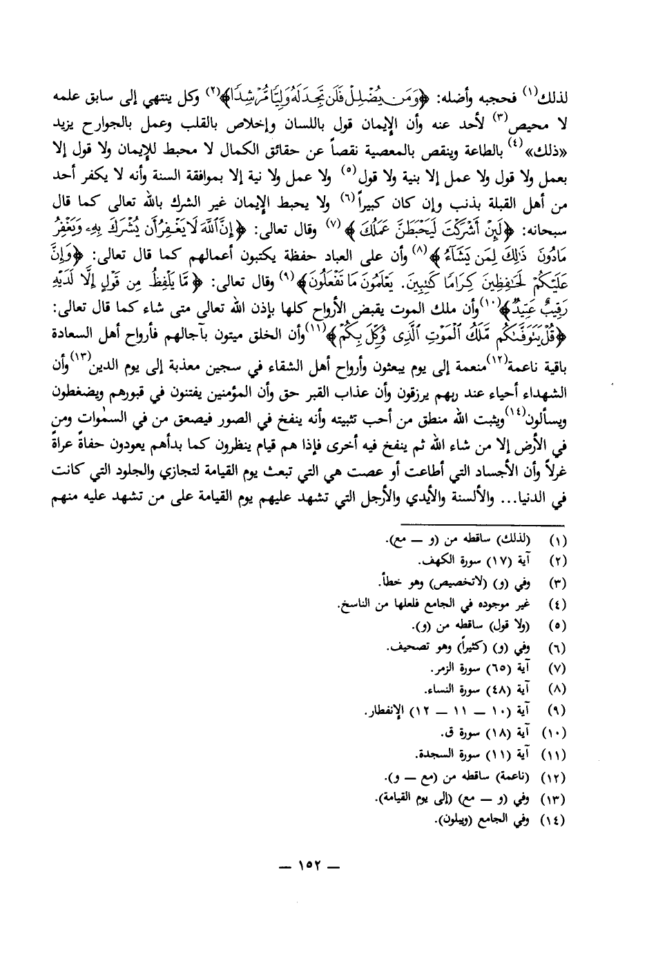 لِذَلِكَ فَحَجَبَهُ وَأَضَلَّهُ: {وَمَنْ يُضْلِلْ فَلَنْ تَجِدَ لَهُ وَلِيًّا مُرْشِدًا} [الكهف: 17] وَكَلٌّ يَنْتَهِي إِلَى سَابِقِ عِلْمِهِ لَا مَحِيصَ لِأَحَدٍ عَنْهُ وَأَنَّ الْإِيمَانَ قَوْلٌ بِاللِّسَانِ وَإِخْلَاصٌ بِالْقَلْبِ وَعَمَلٌ بِالْجَوَارِحِ يَزِيدُ " ذَلِكَ " بِالطَّاعَةِ وَيَنْقُصُ بِالْمَعْصِيَةِ نَقْصًا عَنْ حَقَائِقِ الْكَمَالِ لَا مُحْبِطَ لِلْإِيمَانِ وَلَا قَوْلَ إِلَّا بِعَمَلٍ، وَلَا قَوْلَ وَلَا عَمَلَ إِلَّا بِنِيَّةٍ، وَلَا قَوْلَ وَلَا عَمَلَ وَلَا نِيَّةَ إِلَّا بِمُوَافَقَةِ السُّنَّةِ، وَأَنَّهُ لَا يَكْفُرُ أَحَدٌ مِنْ أَهْلِ الْقِبْلَةِ بِذَنْبٍ وَإِنْ كَانَ كَبِيرًا وَلَا يُحْبِطُ الْإِيمَانَ غَيْرُ الشِّرْكِ بِاللَّهِ تَعَالَى كَمَا قَالَ سُبْحَانَهُ: {لَئِنْ أَشْرَكْتَ لَيَحْبَطَنَّ عَمَلُكَ} [الزمر: 65] وَقَالَ تَعَالَى: {إِنَّ اللَّهَ لَا يَغْفِرُ أَنْ يُشْرَكَ بِهِ وَيَغْفِرُ مَا دُونَ ذَلِكَ لِمَنْ يَشَاءُ} [النساء: 48] وَأَنَّ عَلَى الْعِبَادِ حَفَظَةً يَكْتُبُونَ أَعْمَالَهُمْ كَمَا قَالَ تَعَالَى: {وَإِنَّ عَلَيْكُمْ لَحَافِظِينَ كِرَامًا كَاتِبِينَ يَعْلَمُونَ مَا تَفْعَلُونَ} [الانفطار: 10] وَقَالَ تَعَالَى: {مَا يَلْفِظُ مِنْ قَوْلٍ إِلَّا لَدَيْهِ رَقِيبٌ عَتِيدٌ} [ق: 18] وَأَنَّ مَلَكَ الْمَوْتِ يَقْبِضُ الْأَرْوَاحَ كُلَّهَا بِإِذْنِ اللَّهِ تَعَالَى مَتَى شَاءَ كَمَا قَالَ تَعَالَى: {قُلْ يَتَوَفَّاكُمْ مَلَكُ الْمَوْتِ الَّذِي وُكِّلَ بِكُمْ} [السجدة: 11] وَأَنَّ الْخَلْقَ مَيِّتُونَ بِآجَالِهِمْ فَأَرْوَاحُ أَهْلِ السَّعَادَةِ بَاقِيَةٌ نَاعِمَةٌ إِلَى يَوْمٍ يَبْعَثُونَ وَأَرْوَاحُ أَهْلِ الشَّقَاءِ فِي سِجِّينٍ مُعَذَّبَةٌ إِلَى يَوْمِ الدِّينِ وَأَنَّ الشُّهَدَاءَ أَحْيَاءٌ عِنْدَ رَبِّهِمْ يُرْزَقُونَ، وَأَنَّ عَذَابَ الْقَبْرِ حَقٌّ، وَأَنَّ الْمُؤْمِنِينَ يُفْتَنُونَ فِي قُبُورِهِمْ وَيُضْغَطُونَ وَيُسْأَلُونَ وَيُثَبِّتُ اللَّهُ مَنْطِقَ مِنْ أَحَبَّ تَثْبِيتَهُ وَأَنَّهُ يُنْفَخُ فِي الصُّورِ فَيَصْعَقُ مَنْ فِي السَّمَاوَاتِ وَمَنْ فِي الْأَرْضِ إِلَّا مَنْ شَاءَ اللَّهُ ثُمَّ يُنْفَخُ فِيهِ أُخْرَى فَإِذَا هُمْ قِيَامٌ يَنْظُرُونَ كَمَا بَدَأَهُمْ يَعُودُونَ حُفَاةً عُرَاةً غُرْلًا وَأَنَّ الْأَجْسَادَ الَّتِي أَطَاعَتْ أَوْ عَصَتْ هِيَ الَّتِي تُبْعَثُ يَوْمَ الْقِيَامَةِ لِتُجَازَى، وَالْجُلُودَ الَّتِي كَانَتْ فِي الدُّنْيَا وَالْأَلْسِنَةَ وَالْأَيْدِيَ وَالْأَرْجُلَ الَّتِي تَشْهَدُ عَلَيْهِمْ يَوْمَ الْقِيَامَةِ عَلَى مَنْ تَشْهَدُ عَلَيْهِ مِنْهُمْ