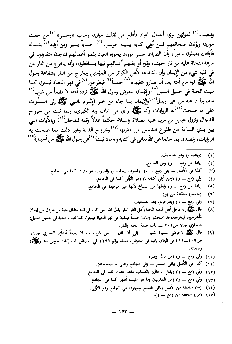 وَتُنْصَبُ الْمُوَازِينُ لِوَزْنِ أَعْمَالِ الْعِبَادِ فَأَفْلَحَ مَنْ ثَقُلَتْ مَوَازِينُهُ، وَخَابَ " وَخَسِرَ " مَنْ خَفَّتْ مَوَازِينُهُ. وَيُؤْتَوْنَ صَحَائِفَهُمْ فَمَنْ أُوتِيَ كِتَابَهُ بِيَمِينِهِ حُوسِبَ حِسَابًا يَسِيرًا وَمَنْ أُوتِيَ كِتَابَهُ بِشَمَالِهِ فَأُولَئِكَ يَصْلَوْنَ سَعِيرًا، وَأَنَّ الصِّرَاطَ جِسْرٌ مَوْرُودٌ يَجُوزُهُ الْعِبَادُ بِقَدْرِ أَعْمَالِهِمْ فَنَاجُونَ مُتَفَاوِتُونَ فِي سُرْعَةِ النَّجَاةِ عَلَيْهِ مِنْ نَارِ جَهَنَّمَ، وَقَوْمٌ أَوْبَقَتْهُمْ أَعْمَالُهُمْ فِيهَا يَتَسَاقَطُونَ، وَأَنَّهُ يَخْرُجُ مِنَ النَّارِ مَنْ فِي قَلْبِهِ شَيْءٌ مِنَ الْإِيمَانِ، وَأَنَّ الشَّفَاعَةَ لِأَهْلِ الْكَبَائِرِ مِنَ الْمُؤْمِنِينَ وَيَخْرُجُ مِنَ النَّارِ بِشَفَاعَةِ رَسُولِ اللَّهِ صَلَّى اللَّهُ عَلَيْهِ وَسَلَّمَ قَوْمٌ مِنْ أُمَتِّهِ بَعْدَ أَنْ صَارُوا " فِيهَا " حُمَمًا فَيُطْرَحُونَ فِي نَهْرِ الْحَيَاةِ فَيَنْبُتُونَ كَمَا تَنْبُتُ الْحَبَّةُ فِي حَمِيلِ السَّيْلِ. وَالْإِيمَانُ بِحَوْضِ رَسُولِ اللَّهِ صَلَّى اللَّهُ عَلَيْهِ وَسَلَّمَ تَرِدْهُ أُمَّتُهُ لَا يَظْمَأُ مَنْ شَرِبَ مِنْهُ، وَيُذَادُ عَنْهُ مَنْ غَيَّرَ وَبَدَّلَ. وَالْإِيمَانُ بِمَا جَاءَ مِنْ خَبَرِ الْإِسْرَاءِ بِالنَّبِيِّ صَلَّى اللَّهُ عَلَيْهِ وَسَلَّمَ إِلَى السَّمَاوَاتِ عَلَى مَا صَحَّتْ بِهِ الرِّوَايَاتُ وَأَنَّهُ صَلَّى اللَّهُ عَلَيْهِ وَسَلَّمَ رَأَى مِنْ آيَاتِ رَبِّهِ الْكُبْرَى، وَبِمَا ثَبَتَ مِنْ خُرُوجِ الدَّجَّالِ وَنُزُولِ عِيسَى بْنِ مَرْيَمَ عَلَيْهِ الصَّلَاةُ وَالسَّلَامُ حَكَمًا عَدَلًا، وَقَتْلِهِ لِلدَّجَّالَ، وَبِالْآيَاتِ الَّتِي بَيْنَ يَدَيِ السَّاعَةِ مِنْ طُلُوعِ الشَّمْسِ مِنْ مَغْرِبِهَا وَخُرُوجِ الدَّابَّةِ وَغَيْرِ ذَلِكَ مِمَّا صَحَّتْ بِهِ الرِّوَايَاتُ، وَنُصَدِّقُ بِمَا جَاءَنَا عَنِ اللَّهِ تَعَالَى فِي كِتَابِهِ وَ " مَا " ثَبَتَ عَنْ رَسُولِ اللَّهِ صَلَّى اللَّهُ عَلَيْهِ وَسَلَّمَ مِنْ أَخْبَارِهِ