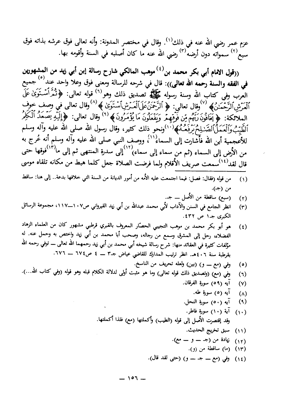 (قَوْلُ الْإِمَامِ أَبِي بَكْرٍ مُحَمَّدِ بْنِ مَوْهِبٍ الْمَالِكِيِّ شَارِحِ رِسَالَةِ ابْنِ أَبِي زَيْدٍ مِنَ الْمَشْهُورِينَ فِي الْفِقْهِ وَالسُّنَّةِ رَحِمَهُ اللَّهُ تَعَالَى) : قَالَ فِي شَرْحِهِ لِلرِّسَالَةِ وَمَعْنَى " فَوْقَ " " وَعَلَا " وَاحِدٌ بَيْنَ جَمِيعِ الْعَرَبِ وَفِي كِتَابِ اللَّهِ تَعَالَى وَسُنَّةِ رَسُولِهِ صَلَّى اللَّهُ عَلَيْهِ وَسَلَّمَ تَصْدِيقُ ذَلِكَ وَهُوَ قَوْلُهُ تَعَالَى: {ثُمَّ اسْتَوَى عَلَى الْعَرْشِ الرَّحْمَنُ} [الفرقان: 59] وَقَالَ تَعَالَى: {الرَّحْمَنُ عَلَى الْعَرْشِ اسْتَوَى} [طه: 5] وَقَالَ تَعَالَى فِي وَصْفِ خَوْفِ الْمَلَائِكَةِ: {يَخَافُونَ رَبَّهُمْ مِنْ فَوْقِهِمْ وَيَفْعَلُونَ مَا يُؤْمَرُونَ} [النحل: 50] وَقَالَ تَعَالَى: {إِلَيْهِ يَصْعَدُ الْكَلِمُ الطَّيِّبُ وَالْعَمَلُ الصَّالِحُ يَرْفَعُهُ} [فاطر: 10] وَنَحْوُ ذَلِكَ كَثِيرٌ، «وَقَالَ رَسُولُ اللَّهِ صَلَّى اللَّهُ عَلَيْهِ وَآلِهِ وَسَلَّمَ لِلْأَعْجَمِيَّةِ: أَيْنَ اللَّهُ؟ فَأَشَارَتْ إِلَى السَّمَاءِ» ، «وَوَصَفَ النَّبِيُّ صَلَّى اللَّهُ عَلَيْهِ وَآلِهِ وَسَلَّمَ أَنَّهُ عُرِجَ بِهِ مِنَ الْأَرْضِ إِلَى السَّمَاءِ (ثُمَّ مِنْ سَمَاءٍ إِلَى سَمَاءٍ) إِلَى سِدْرَةِ الْمُنْتَهَى ثُمَّ إِلَى مَا فَوْقَهَا حَتَّى قَالَ: لَقَدْ سَمِعْتُ صَرِيفَ الْأَقْلَامِ وَلَمَّا فُرِضَتِ الصَّلَاةُ جَعَلَ كُلَّمَا هَبَطَ مِنْ مَكَانِهِ تَلَقَّاهُ مُوسَى